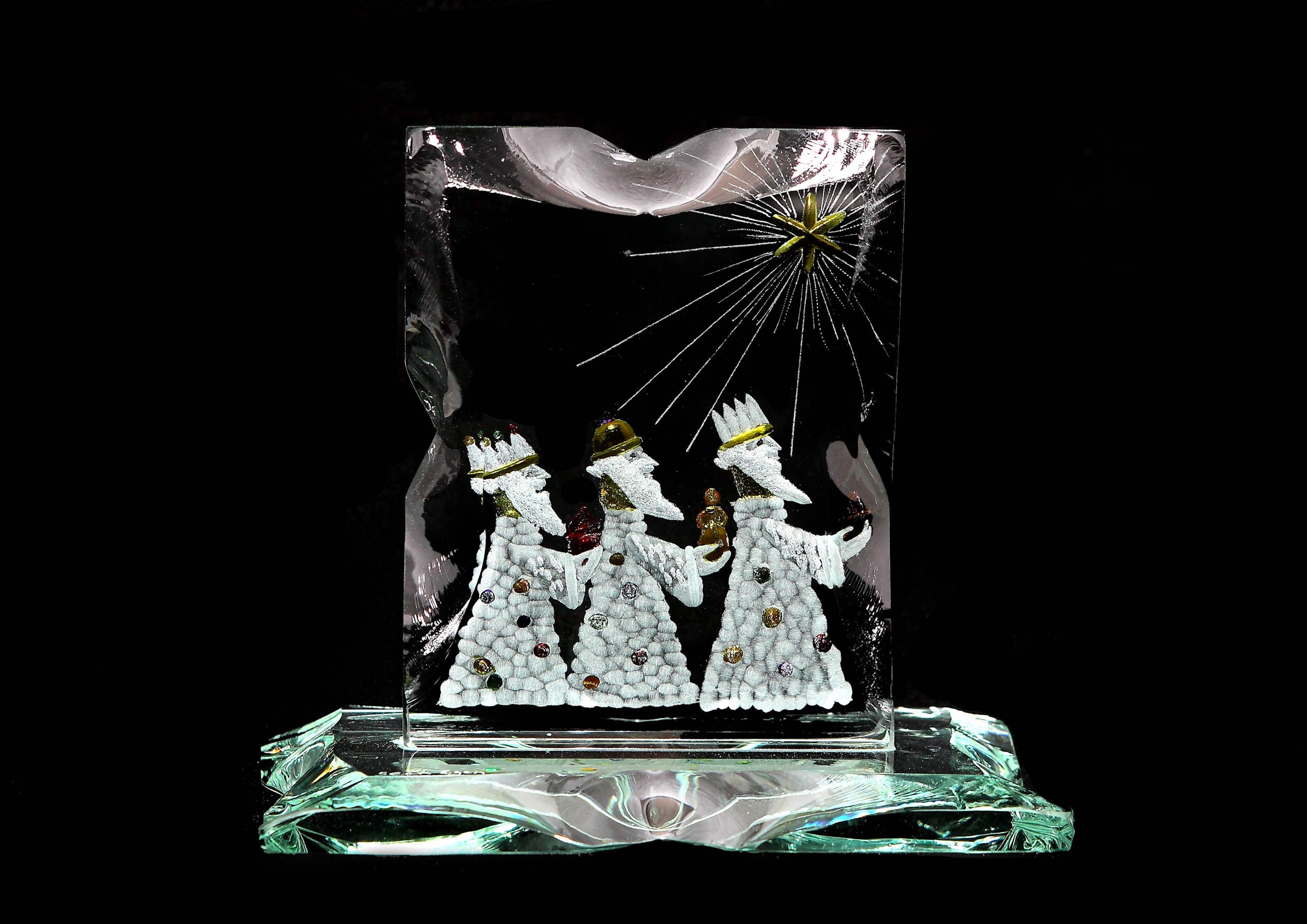 Crystal Block on Stand depicting the Three Wise Men. Hand painted to give a stained glass effect.