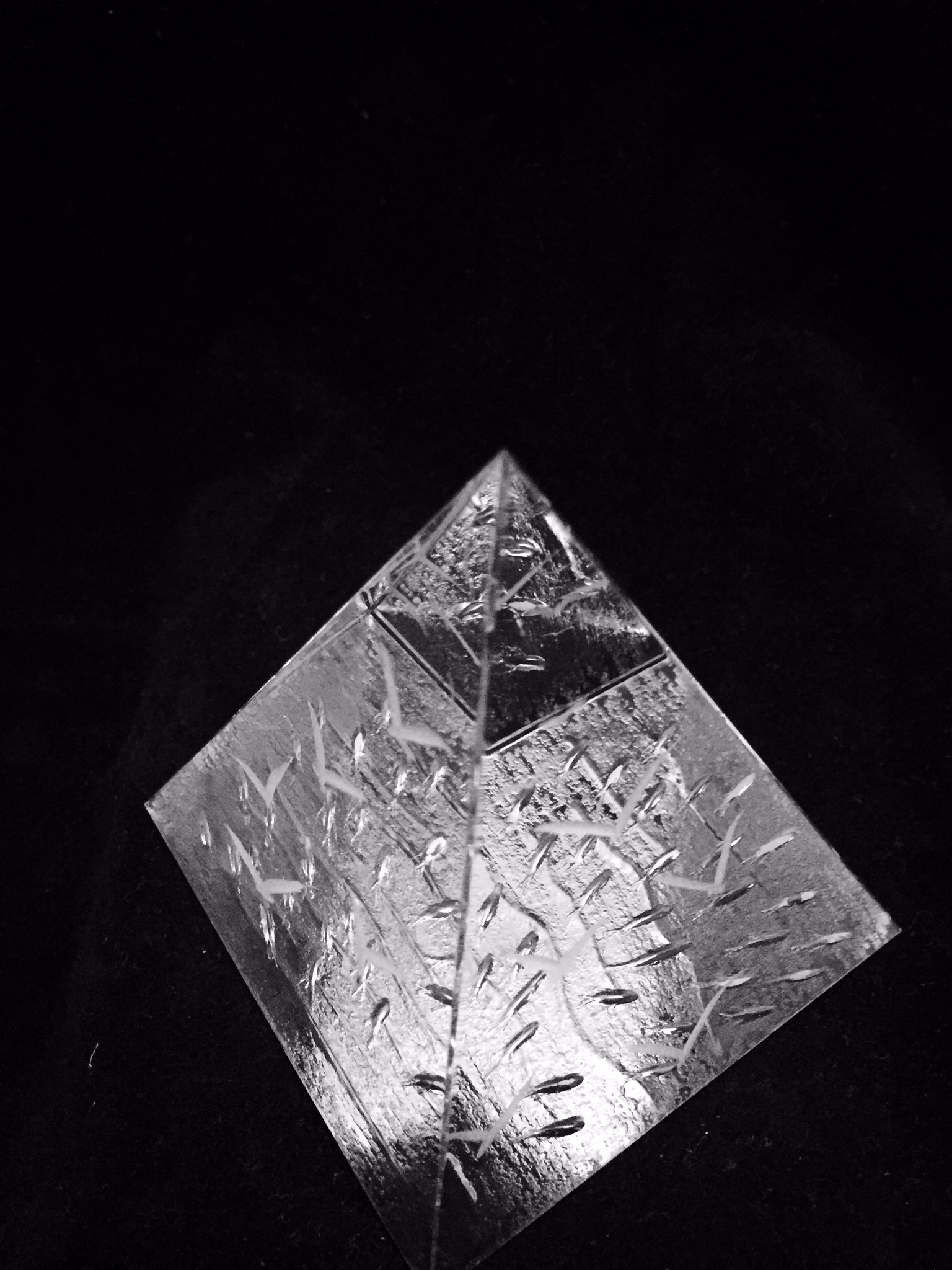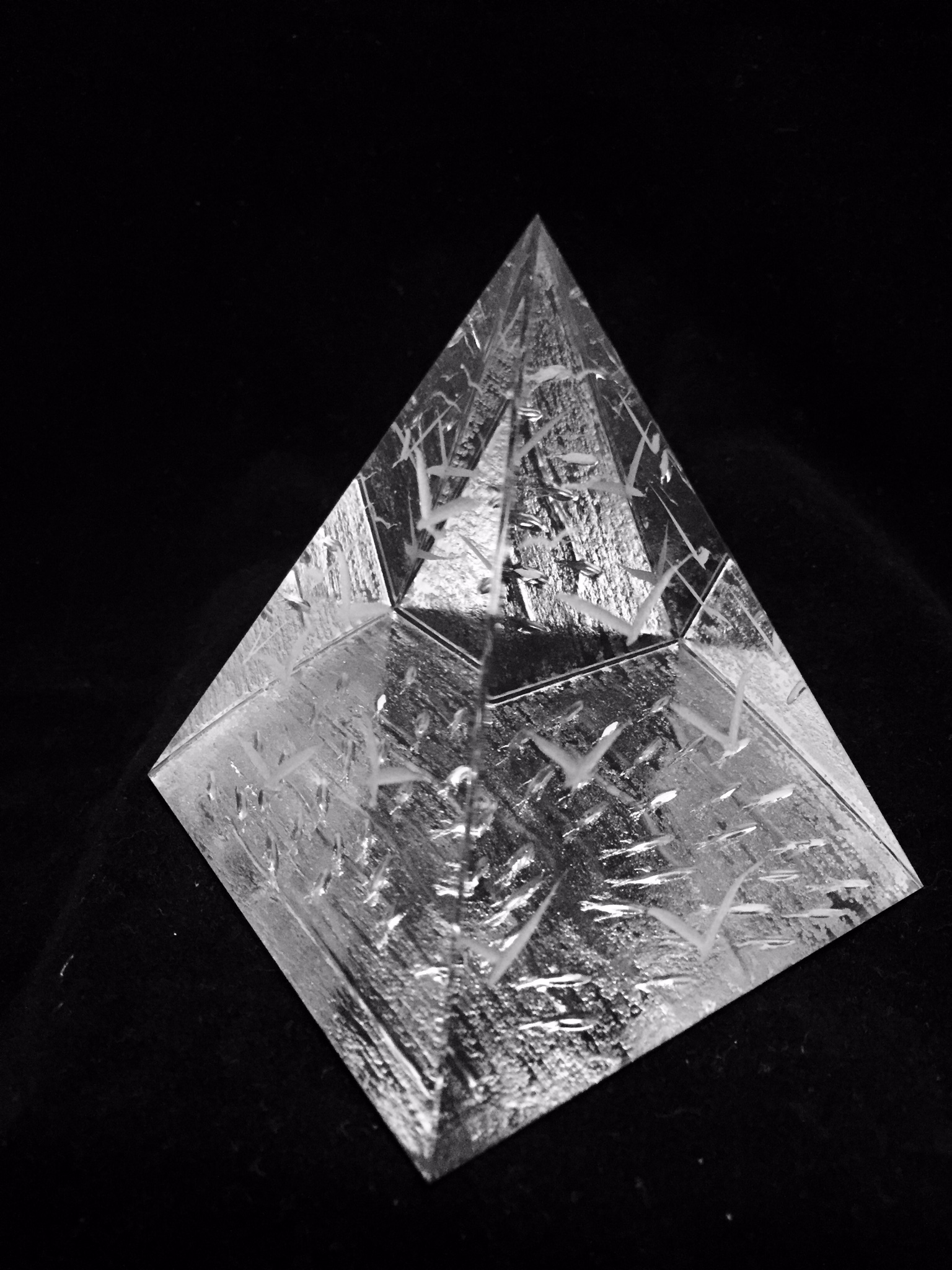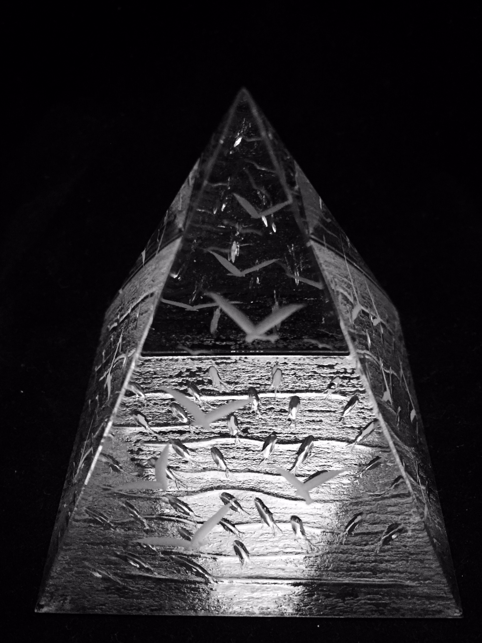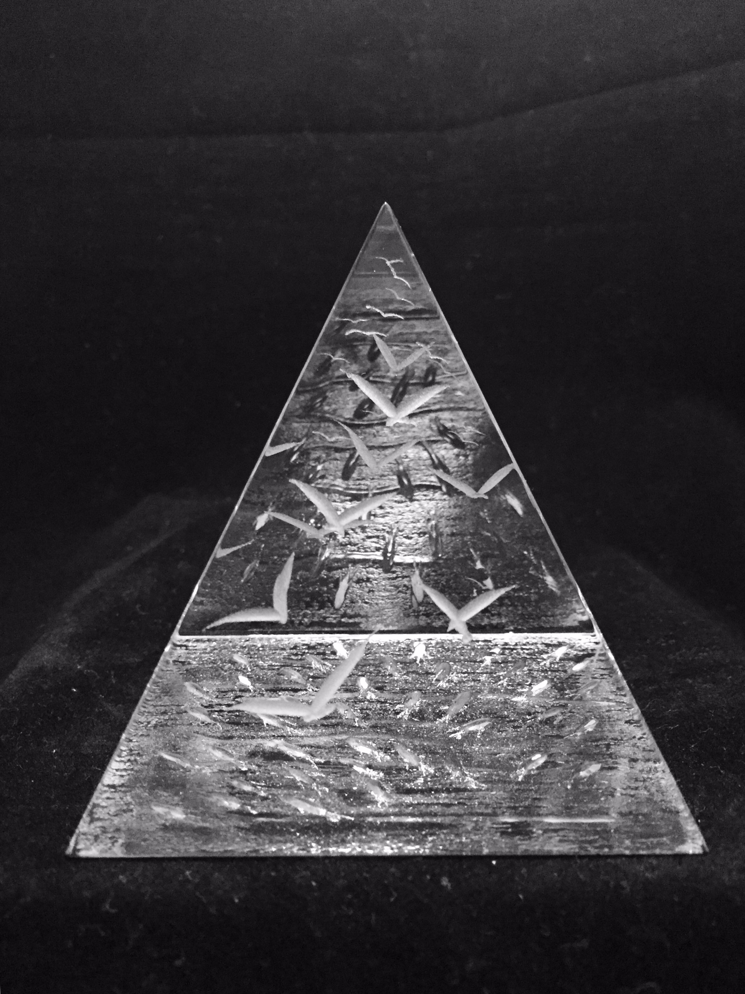 3" crystal pyramid. Decorated with seagulls on four sides and a shoal of fish on the bottom. Creates various optical illusions. Comes in a blue velvet lined casket.