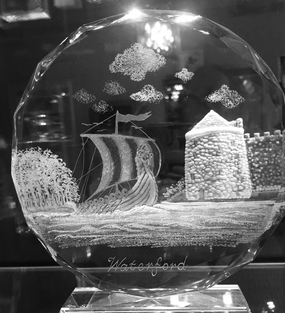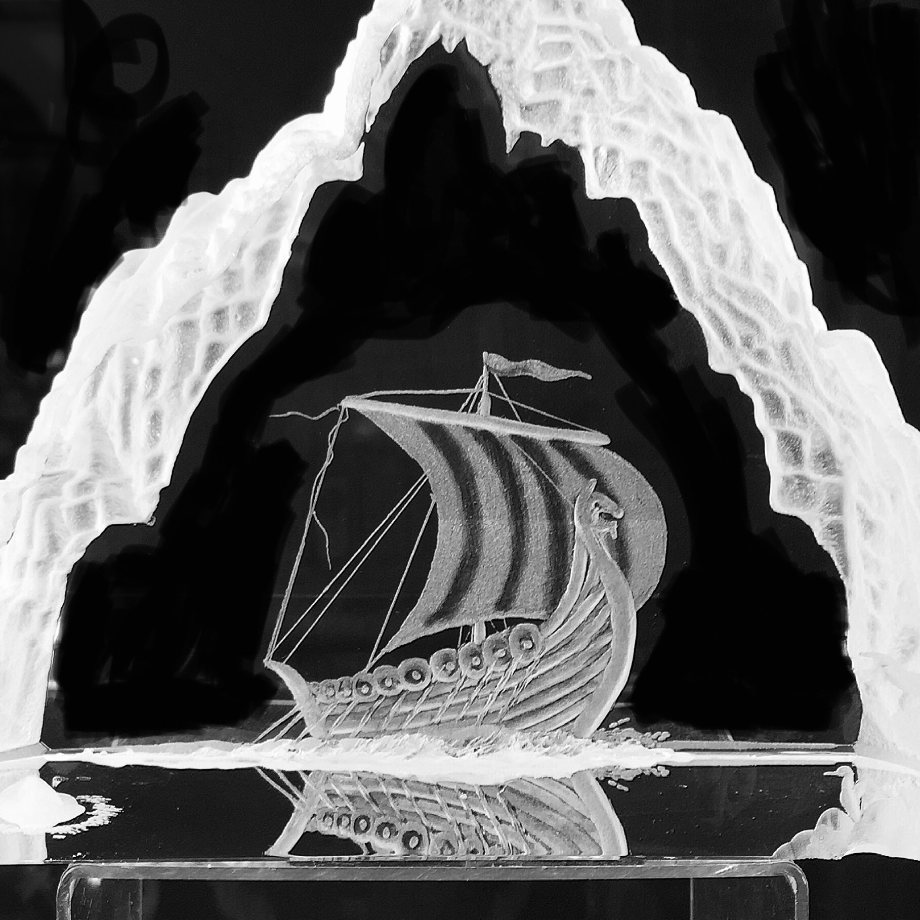 "8 Plate on crystal stand, also a Ice Block of Crystal Engraved with Viking Ships,
