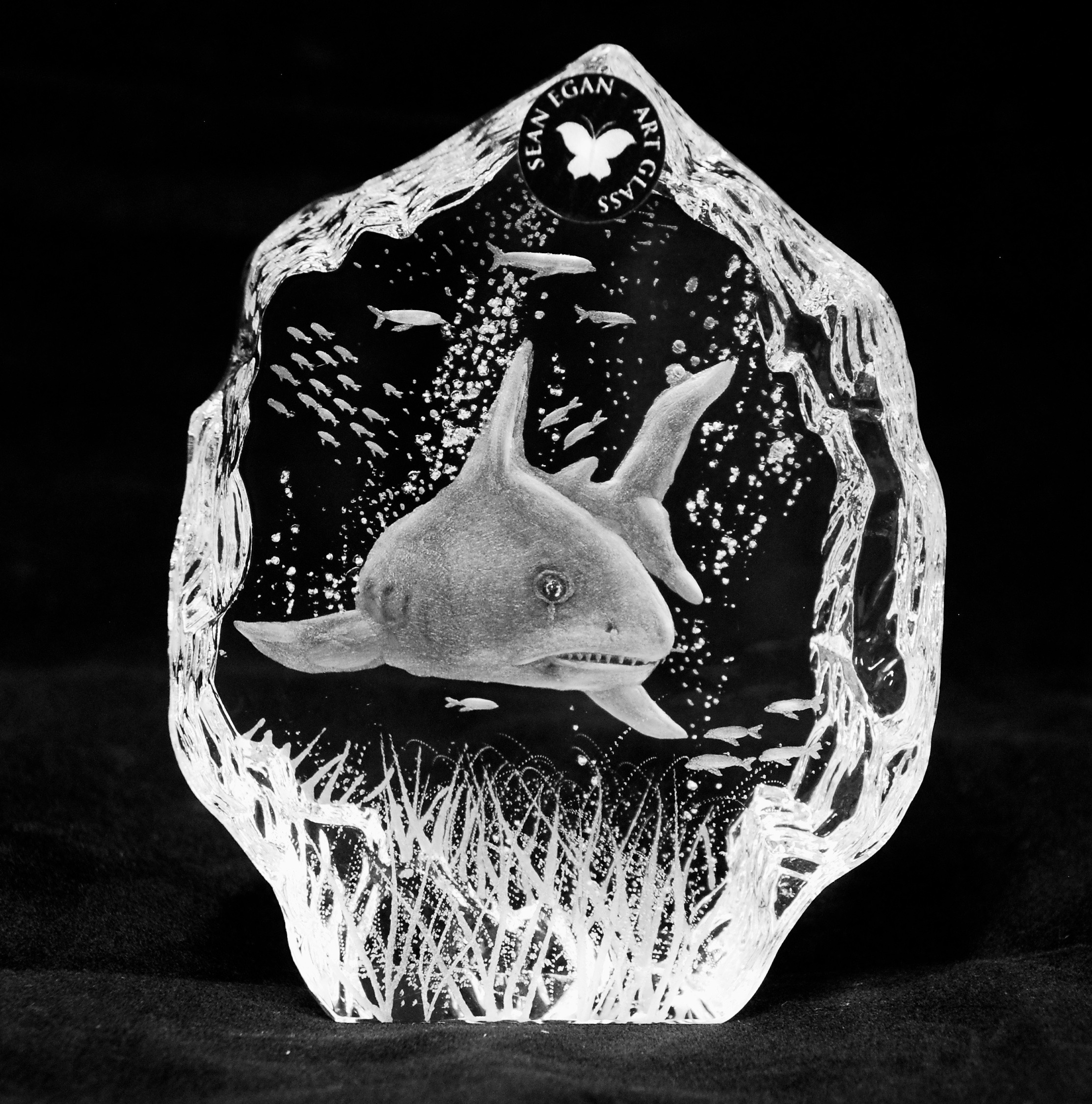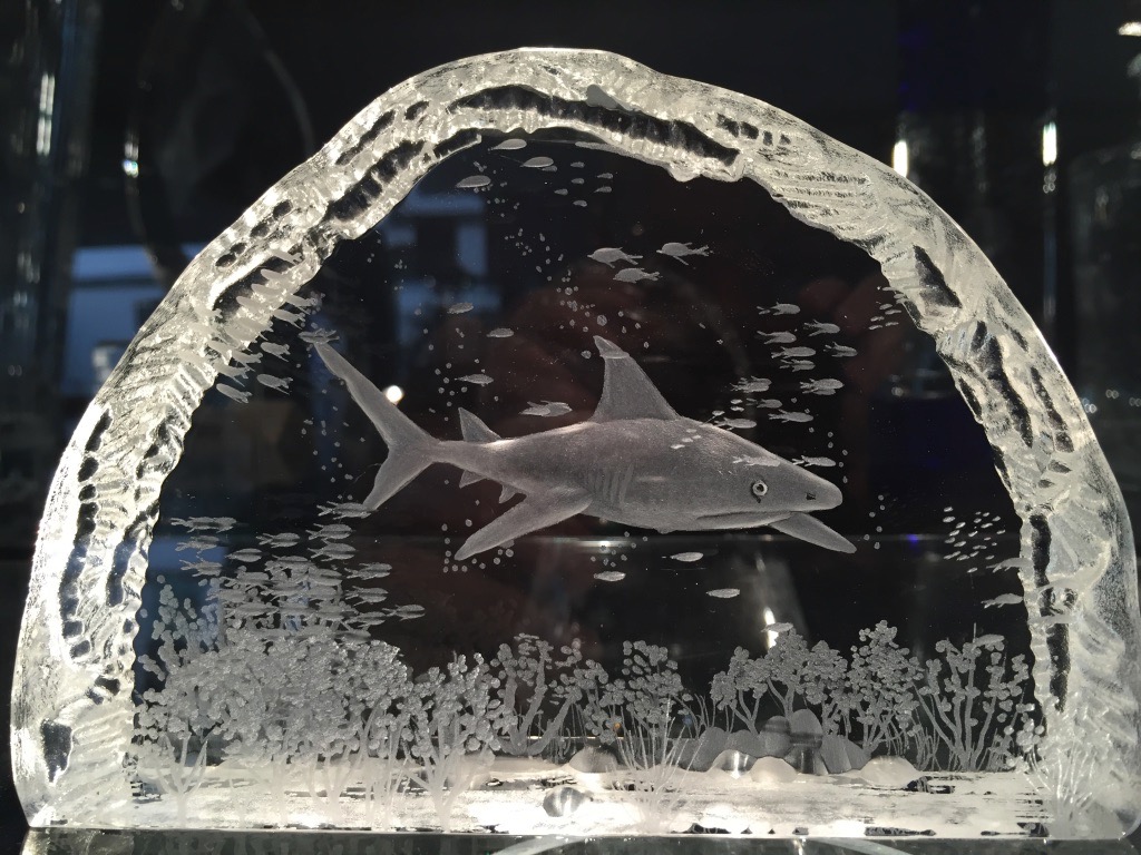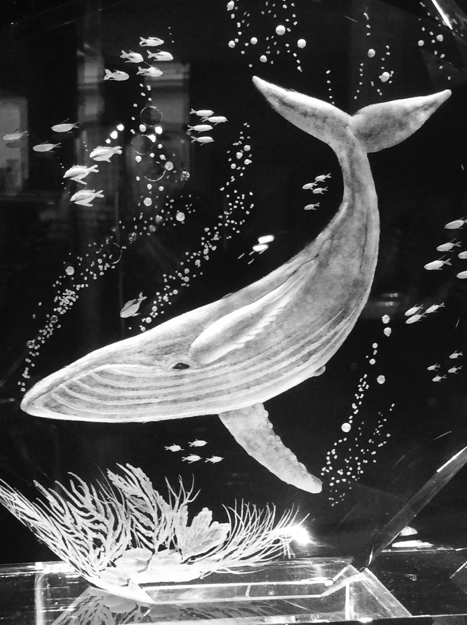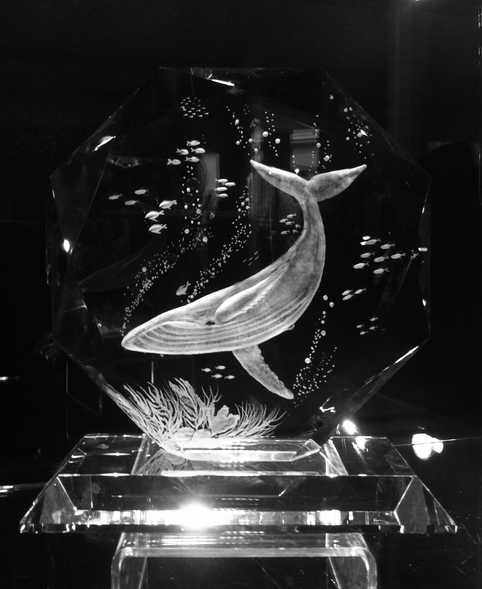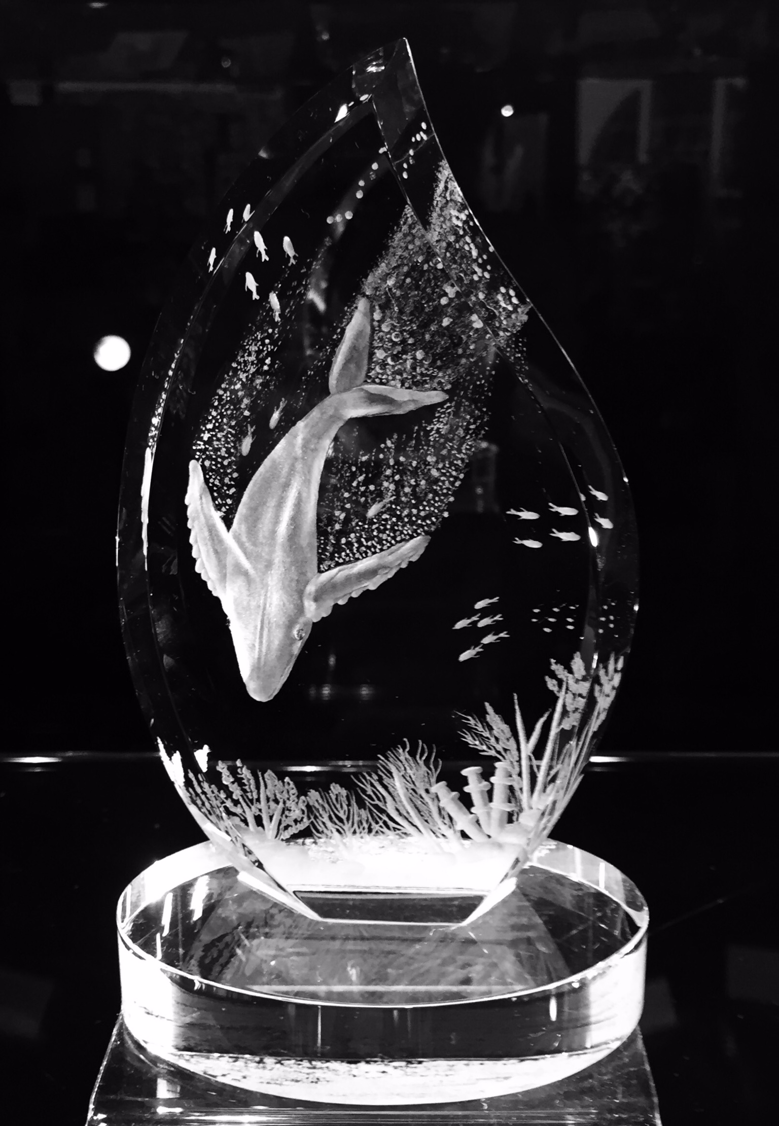 8" Flame shaped crystal block on glass base. Engraved with an underwater scene of a diving humpback whale, shoals of tiny fish and ocean floor and coral reef.