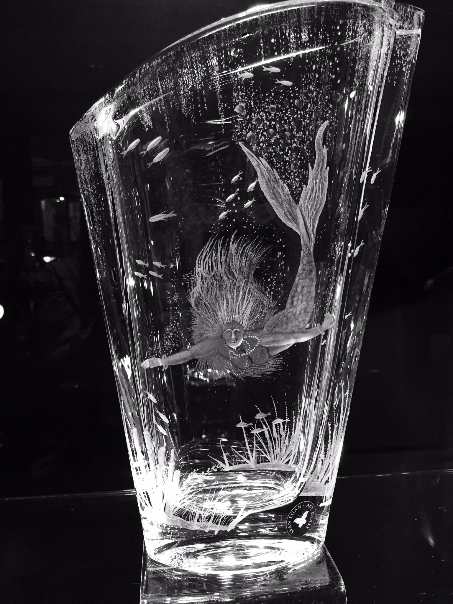 Large crystal block with engraving of a mermaid a legendary aquatic creature with a female torso and the tail of a fish. Mermaid themes are very popular and can be engraved on a variety of large glass blocks and vases. Contact Sean for a quote. email.