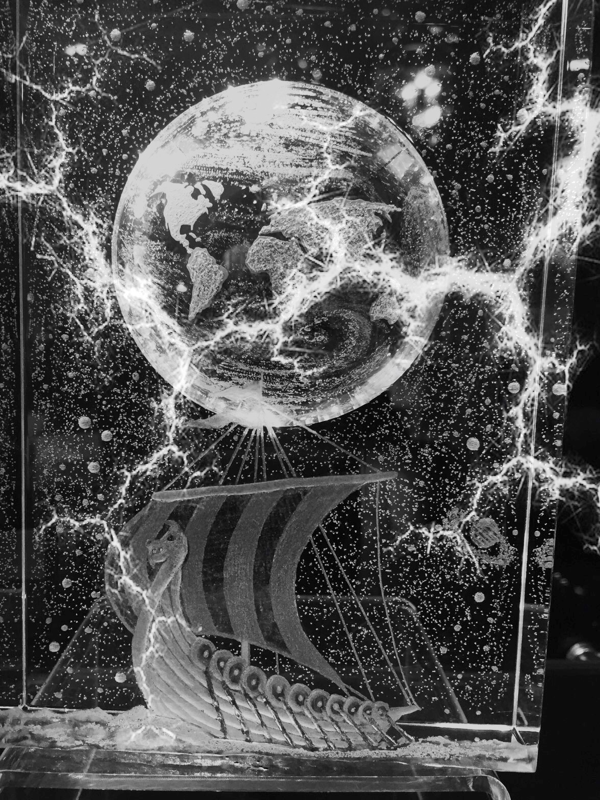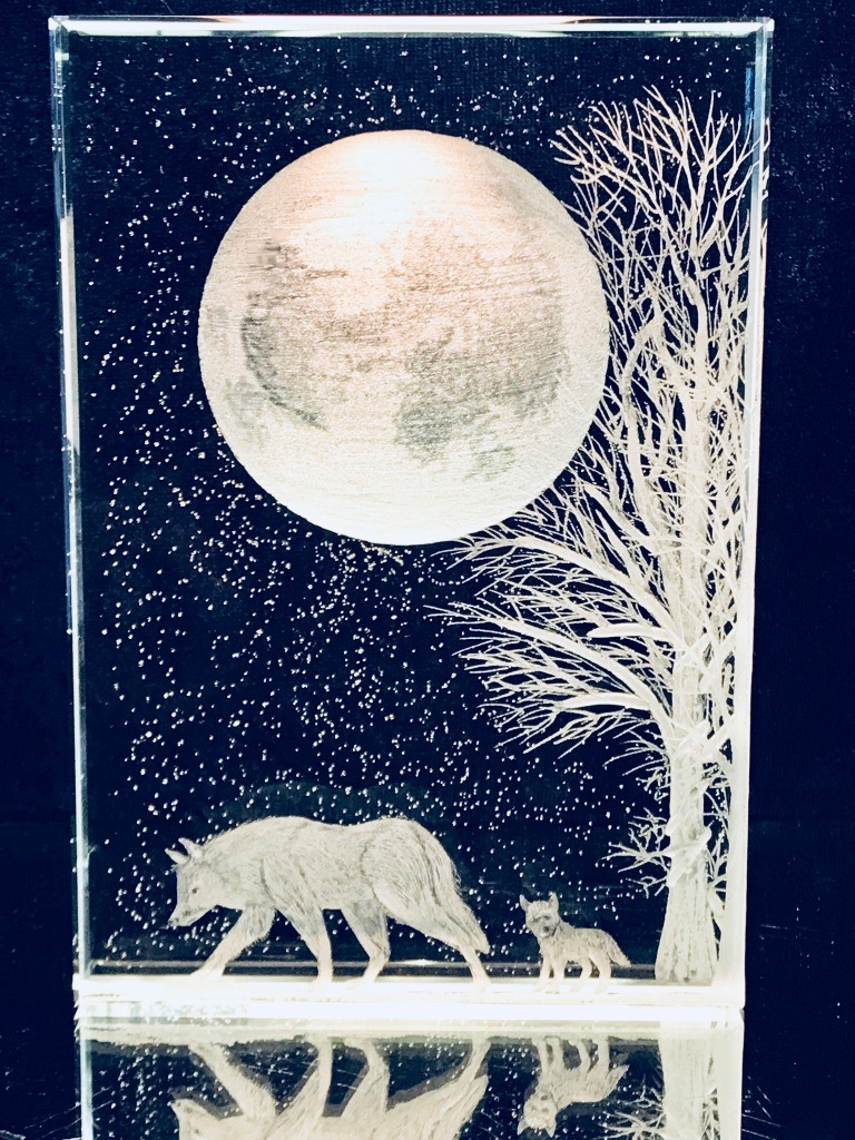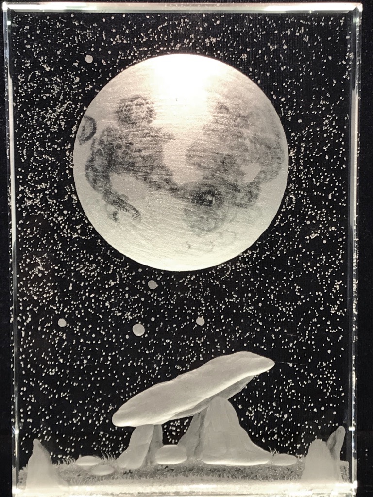 "Mystical Ireland" Part of a series of crystal blocks with scenes of Irish landscape. The full moon on an Irish Dolman where wolfs use to roam around freely .Until the Viking came.