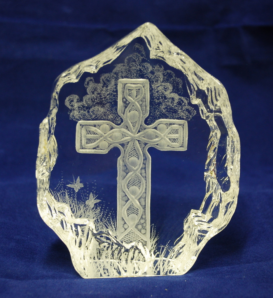 email me.Part of a series of crystal blocks depicting Irish scenes. 5.25"H x 4"W x 1.5"D. Celtic themes are very popular and can be engraved on a wide variety of glass products.