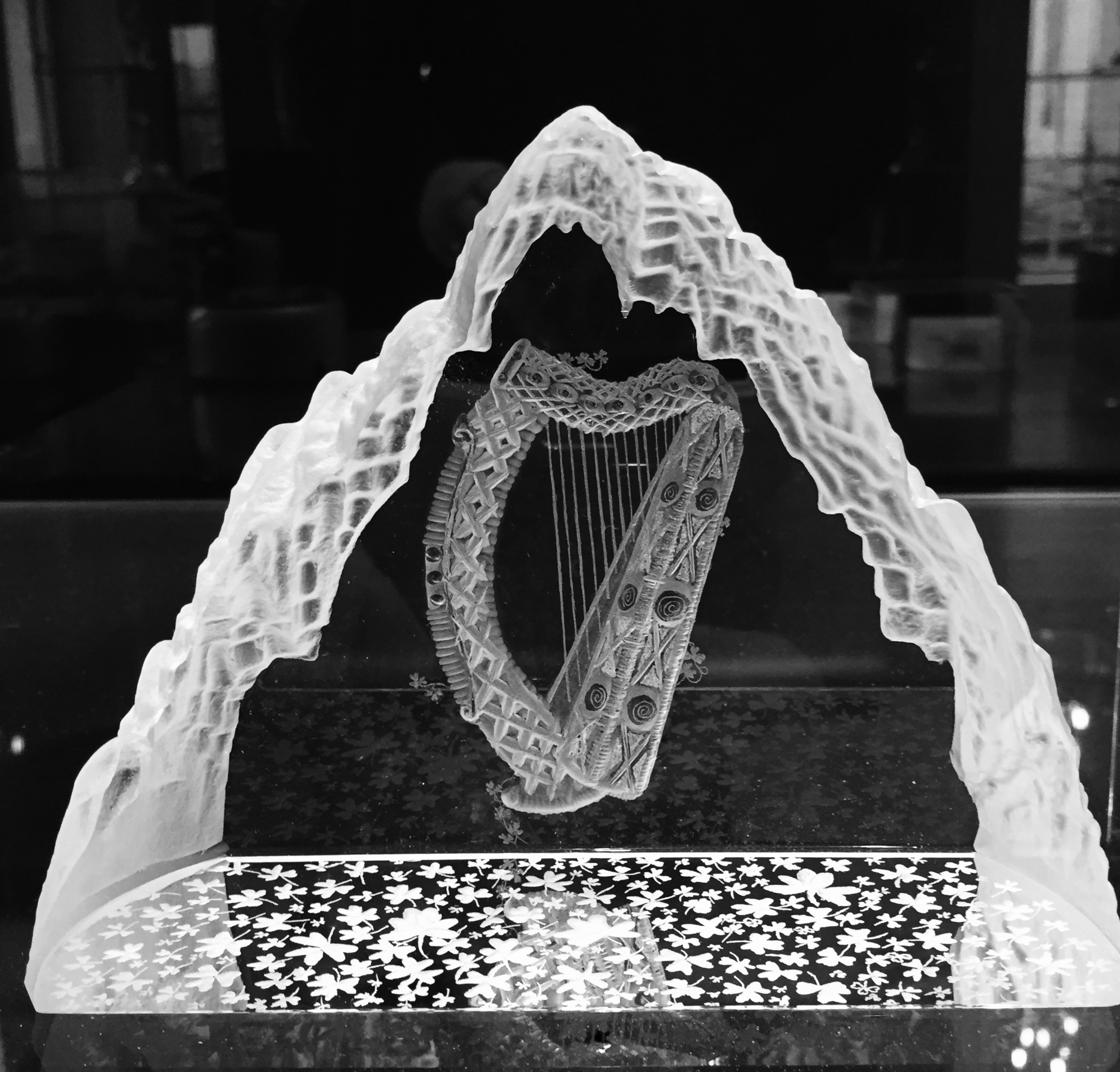 8″round glass circle with glass base also a ice block ,engraved with Irish harp and shamrock iconic images of Ireland. Very popular Irish harps can be engraved on any glass item.