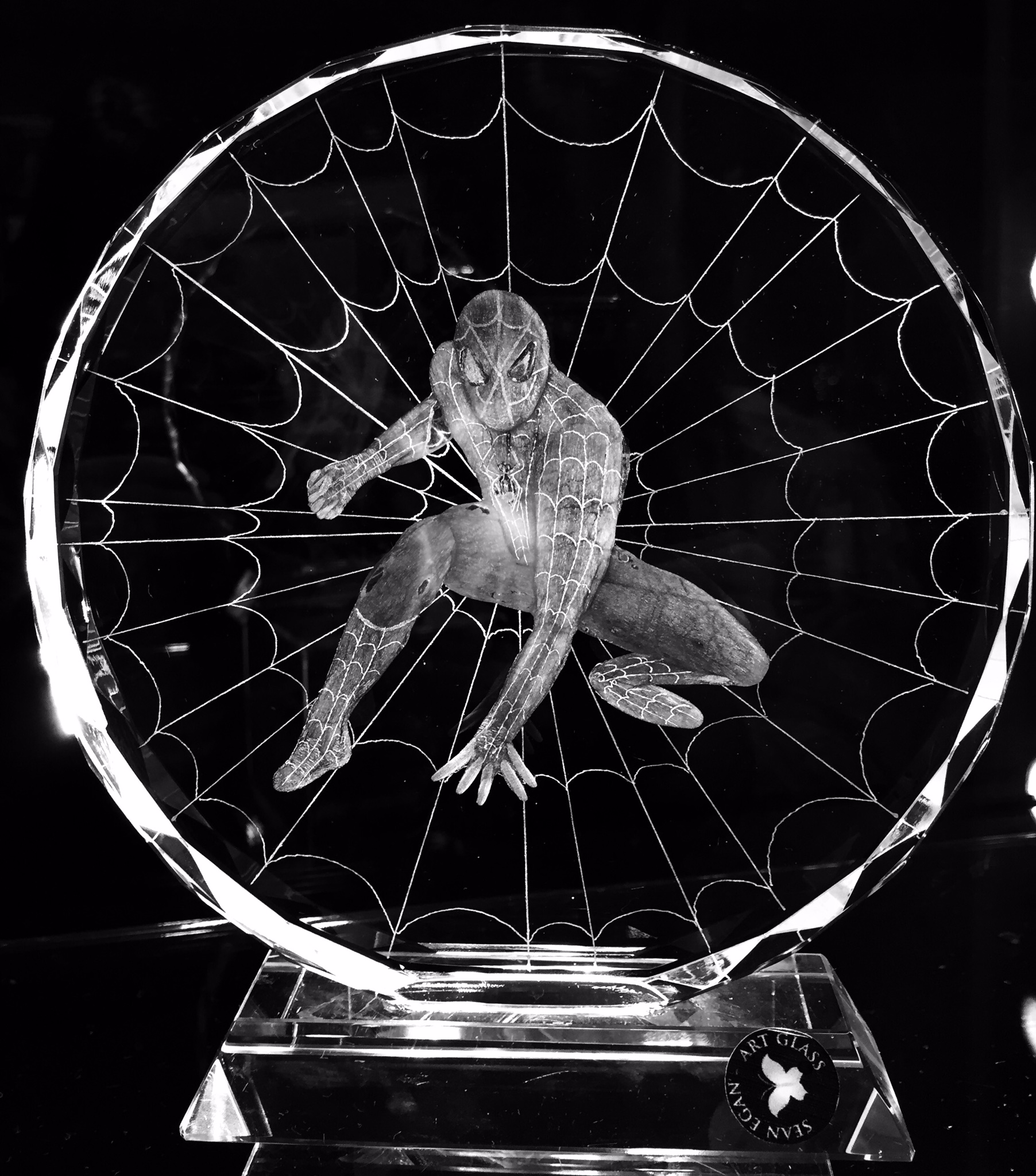 Spiderman hand engraved on an 8" Circular Glass with stand.