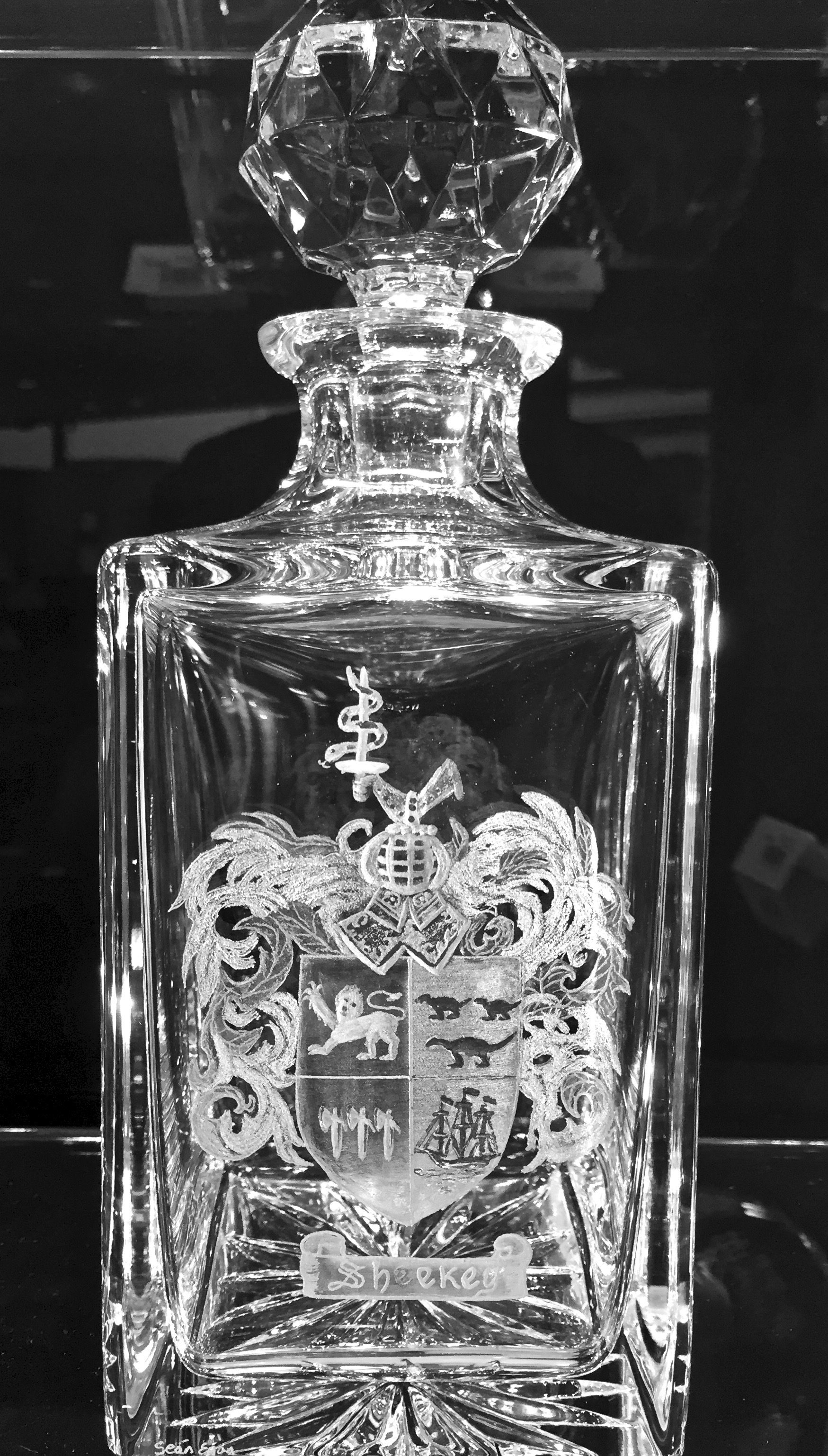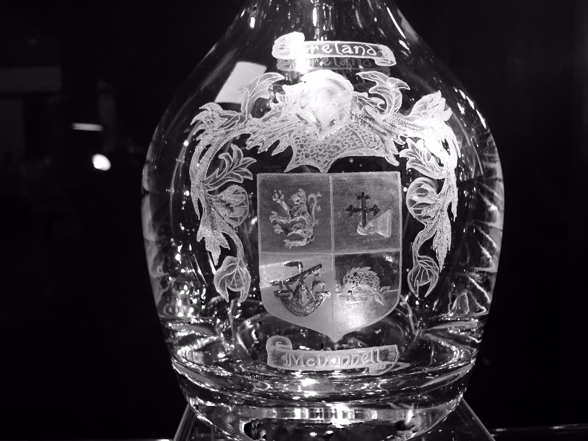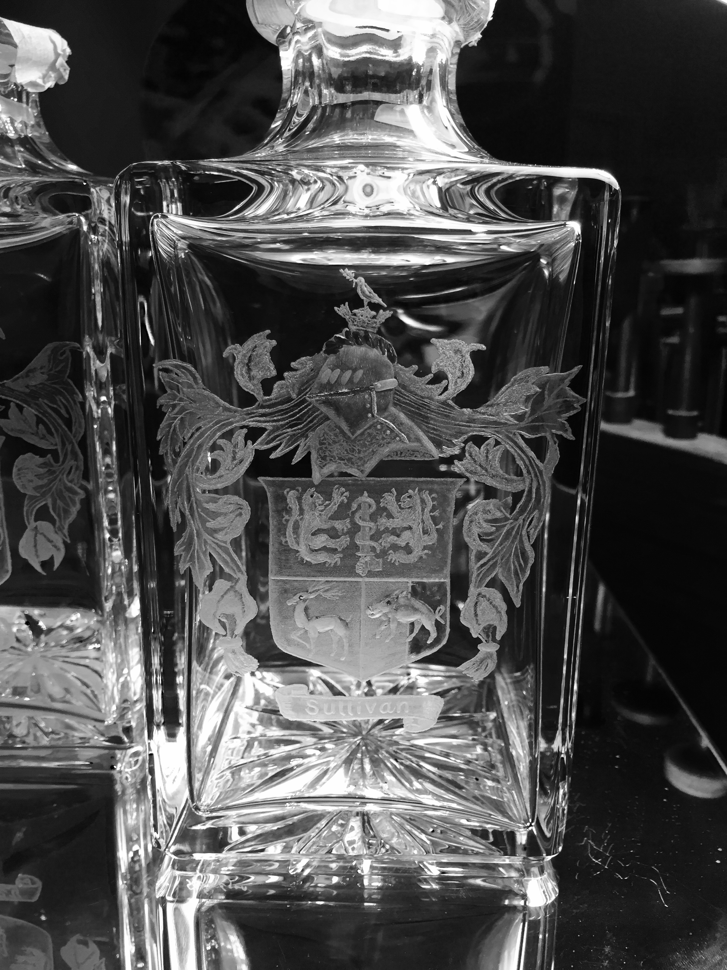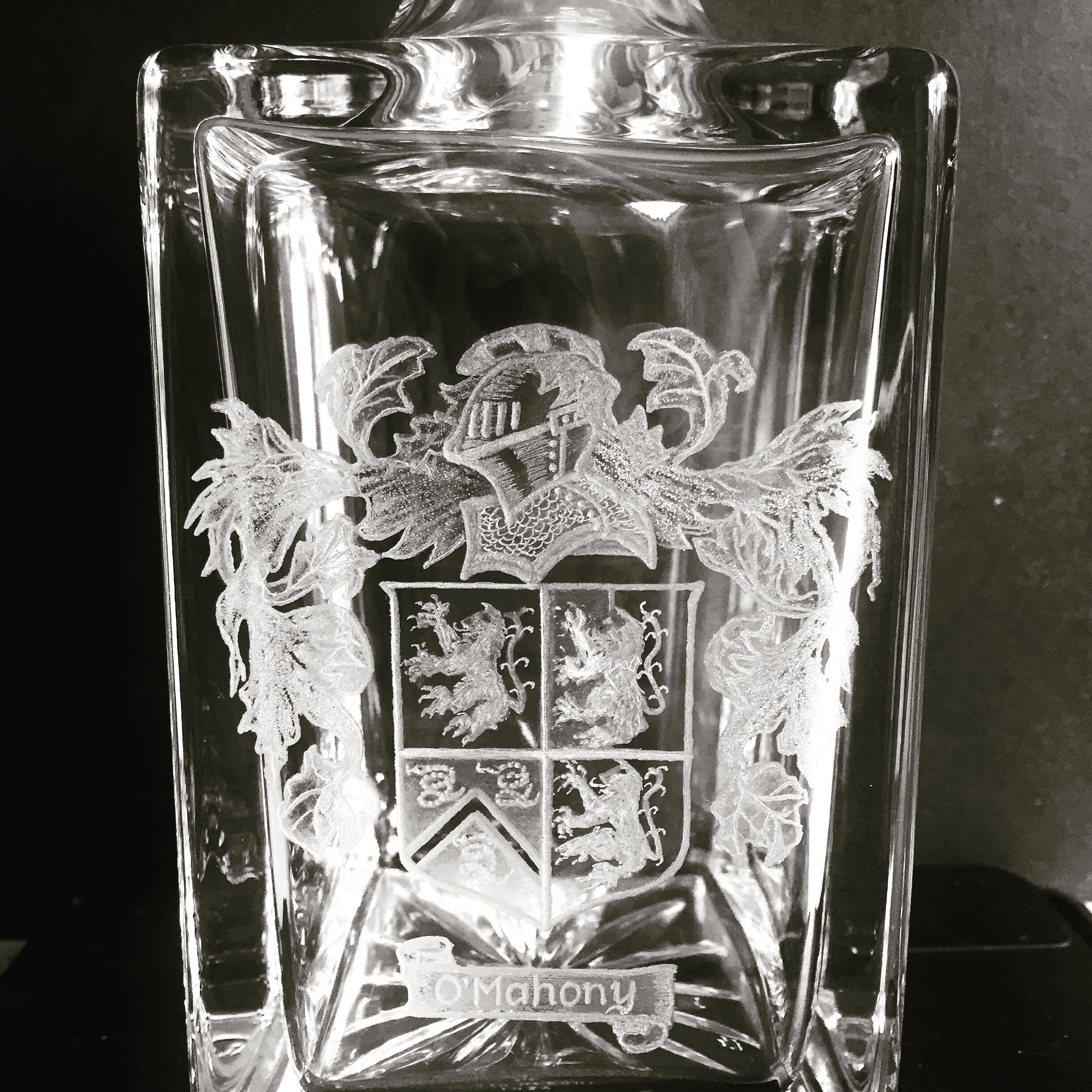 Family Crest Engraving seen here on a all types of decanter. Large selection of decanters available.family crest can also be engraved on Irish whiskey Glasses,Crystal Blocks, plaques and all types of glasses. email me for special ideas. "we all have a Coat of arms " Let me see if i can find yours.