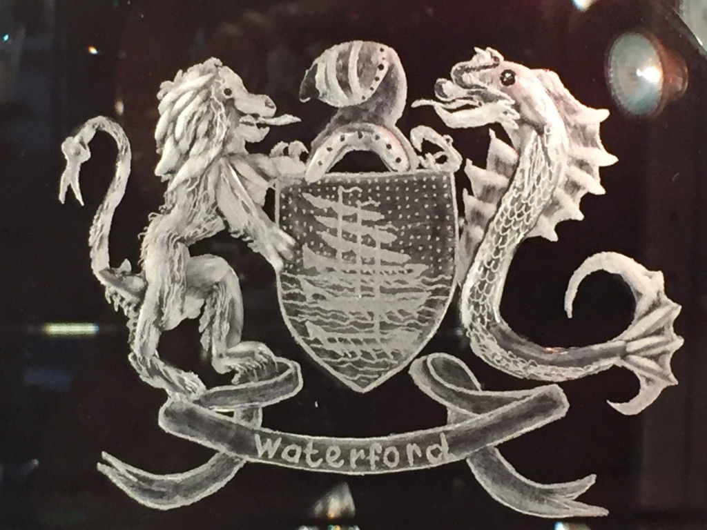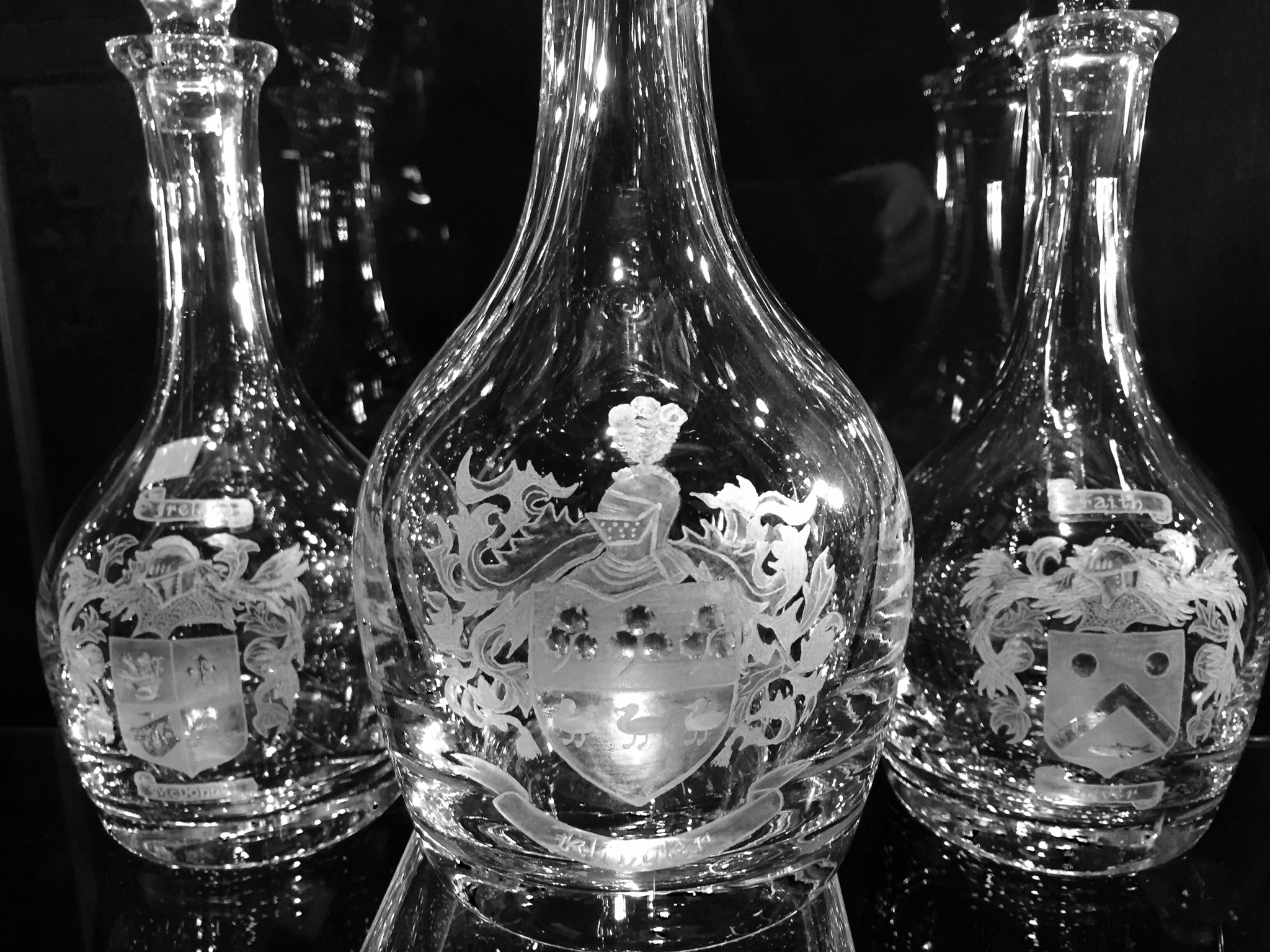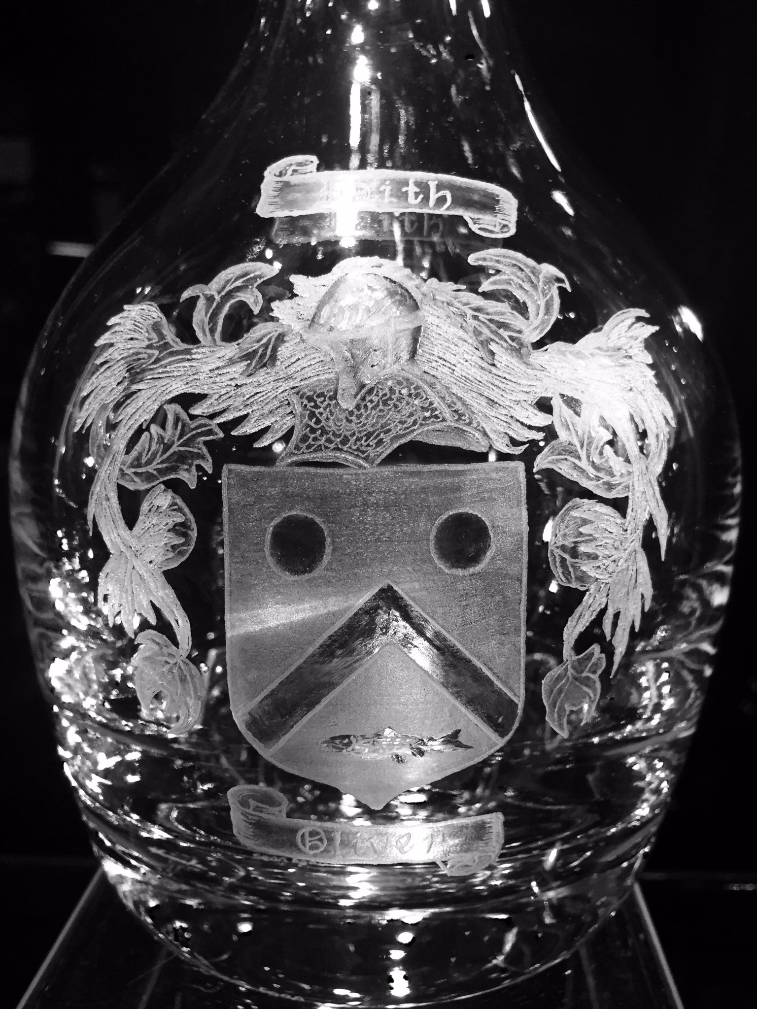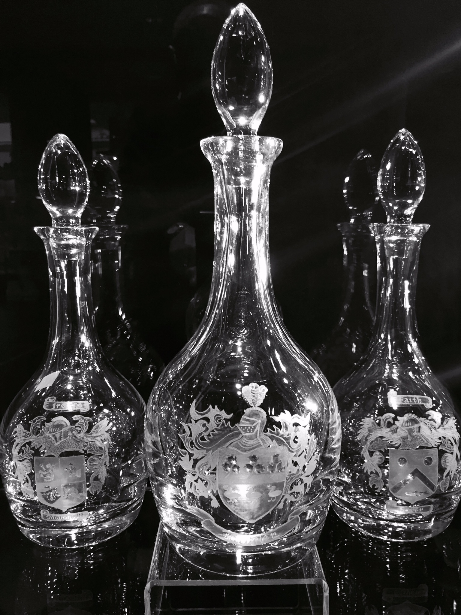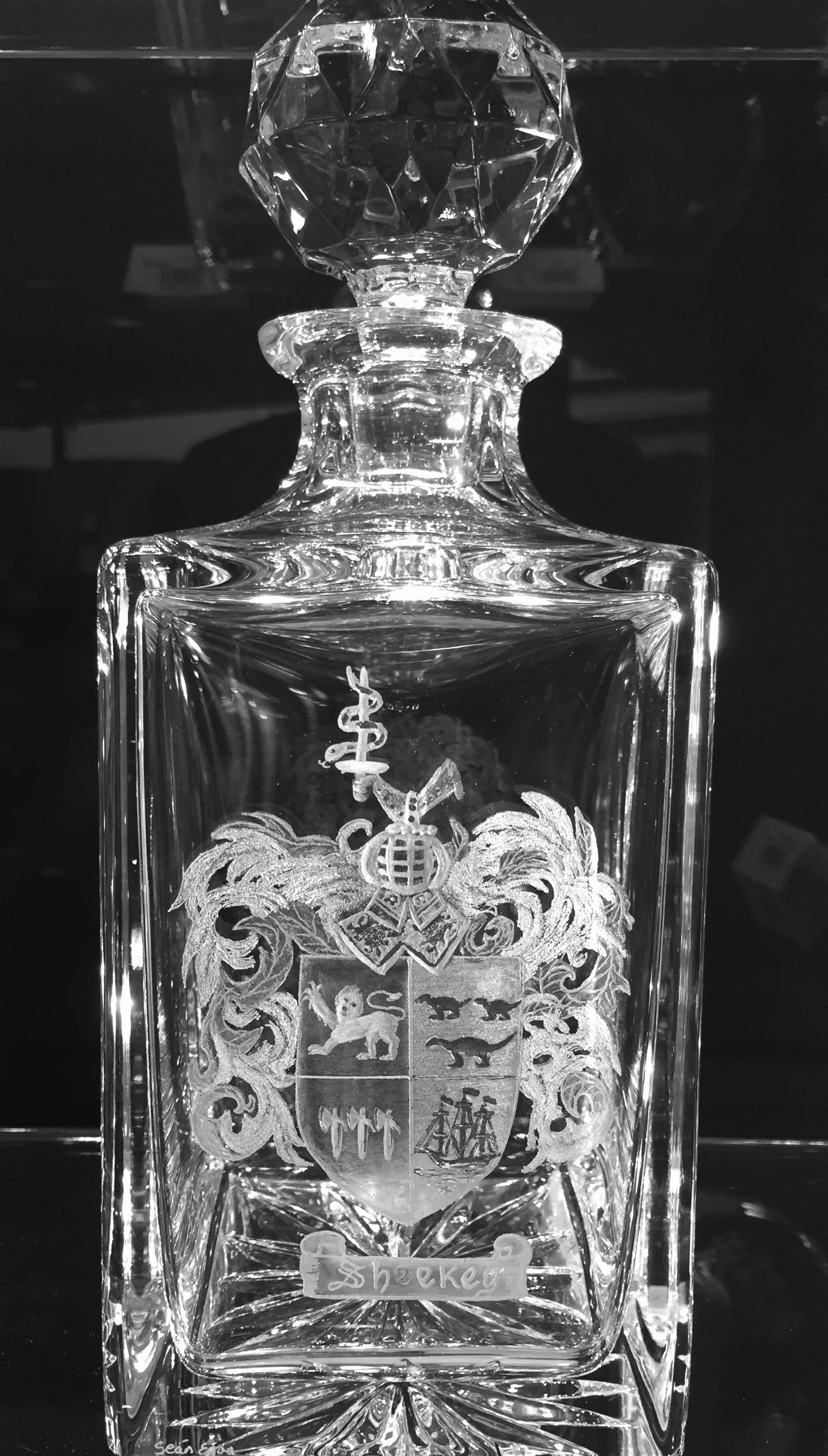 Family Crest Engraving seen here on a all types of decanter. Large selection of decanters available.family crest can also be engraved on Irish whiskey Glasses,Crystal Blocks, plaques and all types of glasses. email me for special ideas. "we all have a Coat of arms " Let me see if i can find yours.