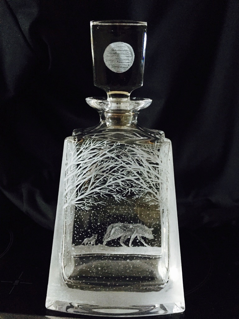 Engraving of Wolves Images , these can be engraved on any piece of crystal ,like square blocks with the moon ,round plaques of crystal glass and more, please email me with your Wolf ideas ,Wolf engraved on a Decanter is €300
