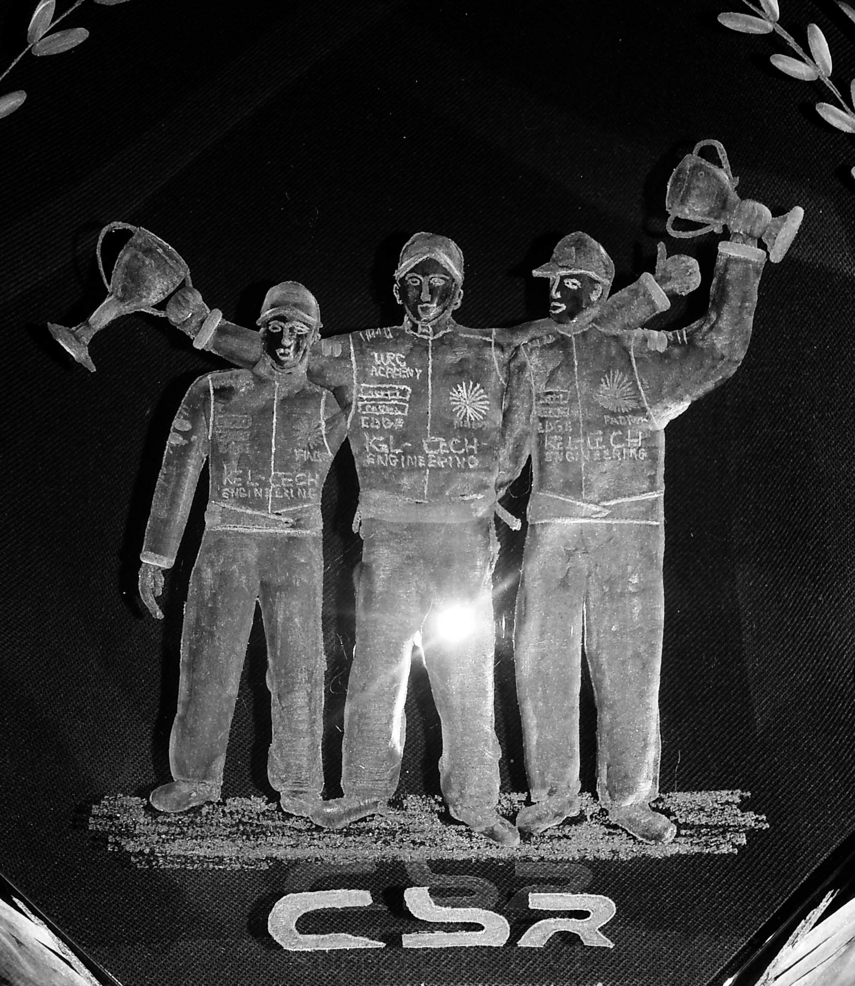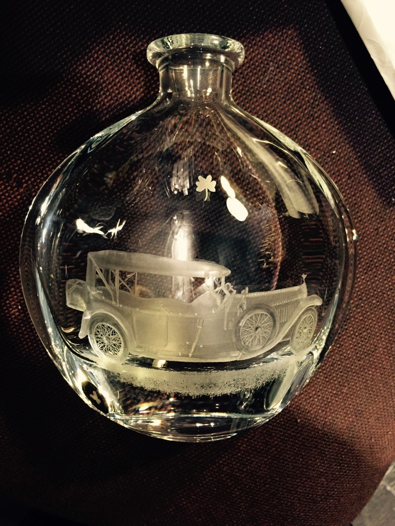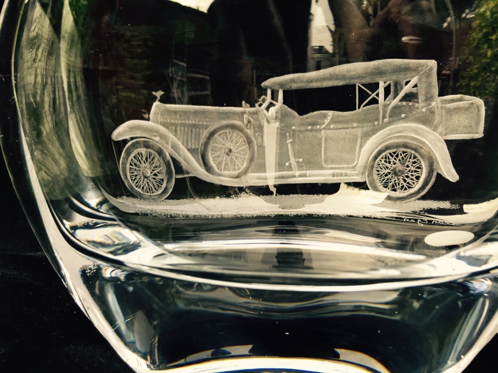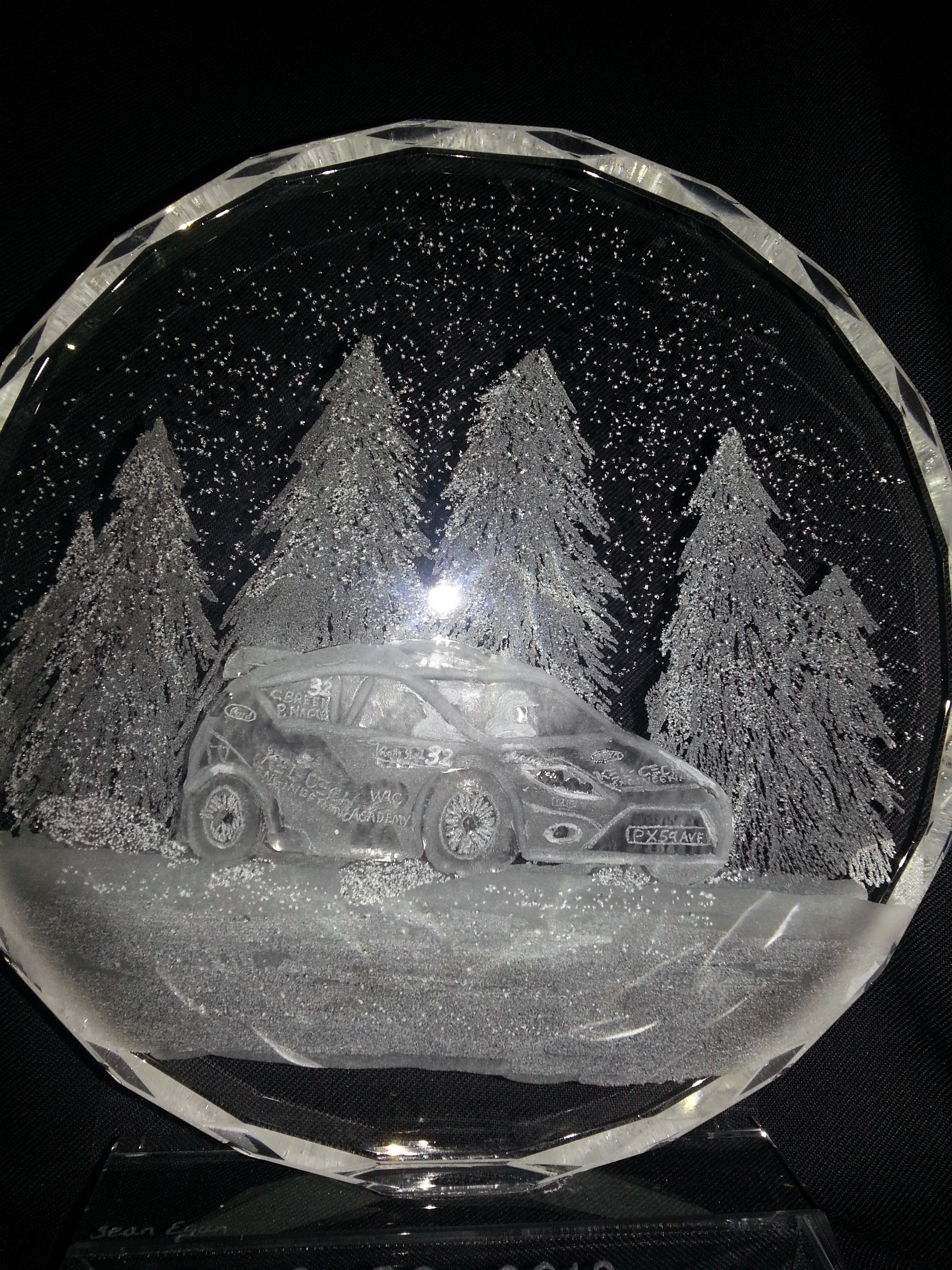 8" circular crystal block on stand. Commissioned piece of a rally car driving through Norway during the winter time for a rallying award.also engraved on a decanter is a old 1920s slivershadow