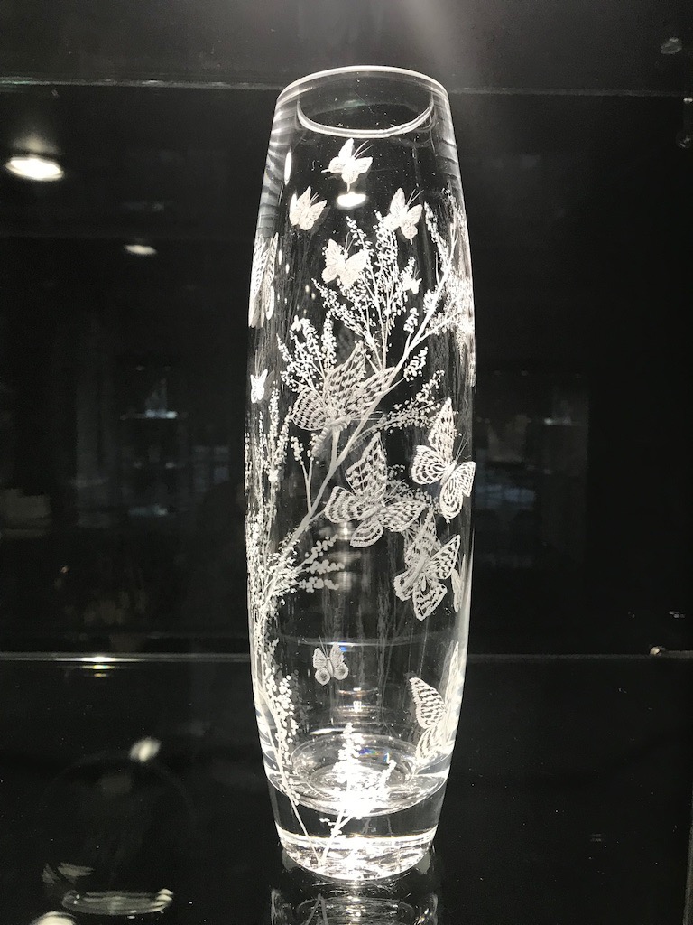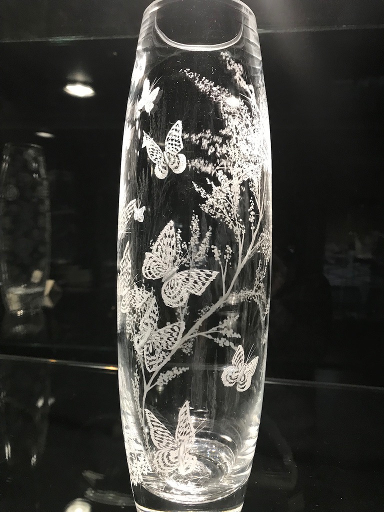 12" slim vase engraved with the popular "Meadow Butterflies" design, which is unique to Sean Egan Art Glass. This design if available on a wide range of glass items