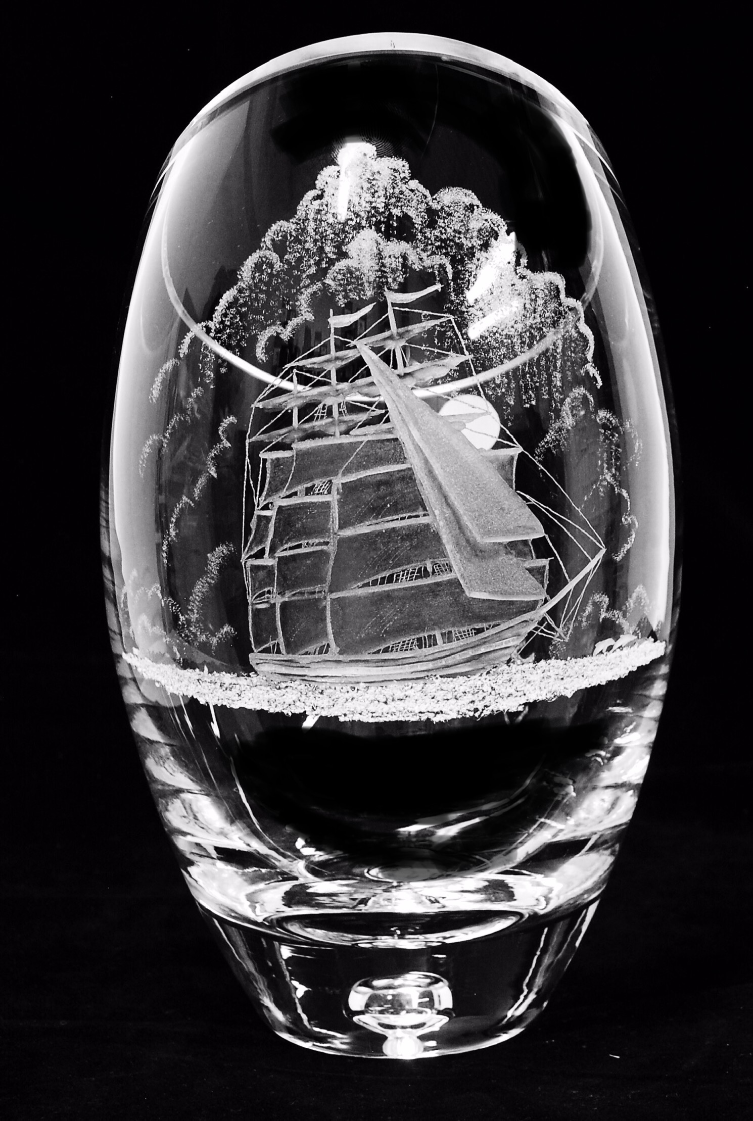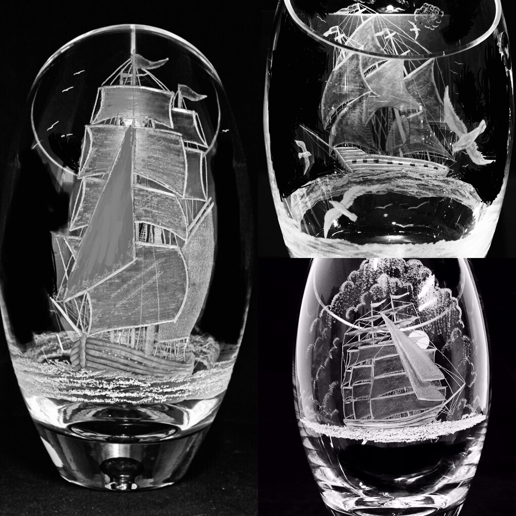 10.5" sliced bubble vase engraved with a cutter ship in full sail. Cutter ship and tall ships engraving available on other glass items. Contact Sean for details