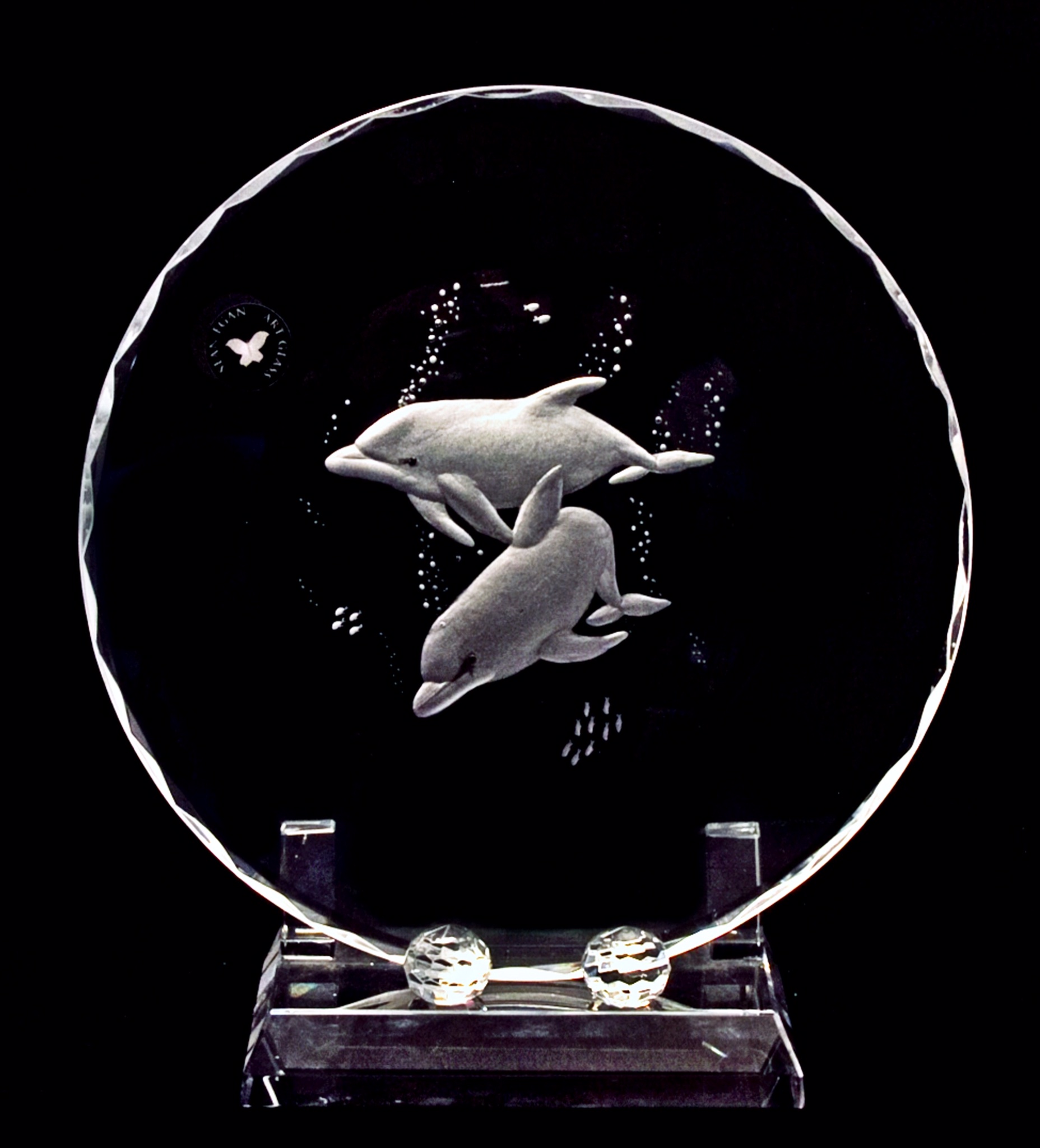 8" Crystal Circle on a stand. Engraved with two dolphins. Dolphins scene can be engraved on a wide variety of glassware. The circle glass is also suitable for a wide range of other engravings to clients specifications. Contact Sean by email for queries.