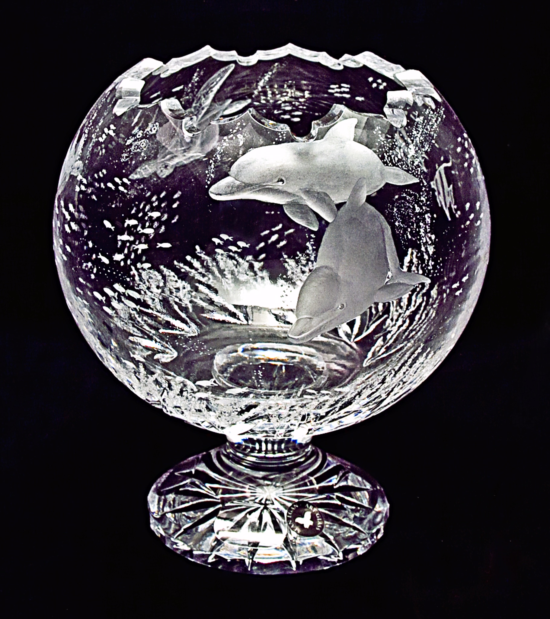 Large Crystal Bowl Engraved with Dolphins and sea life.