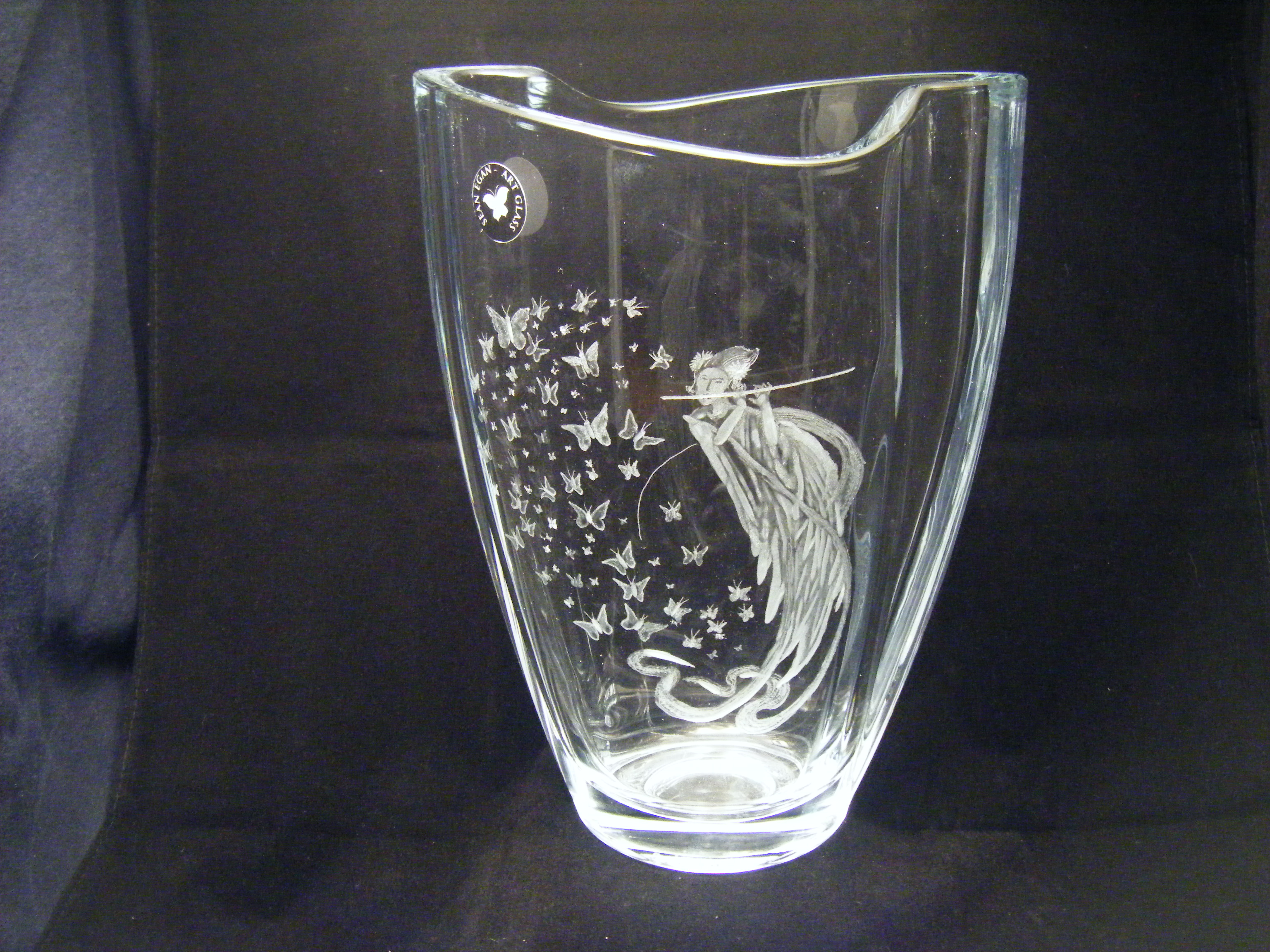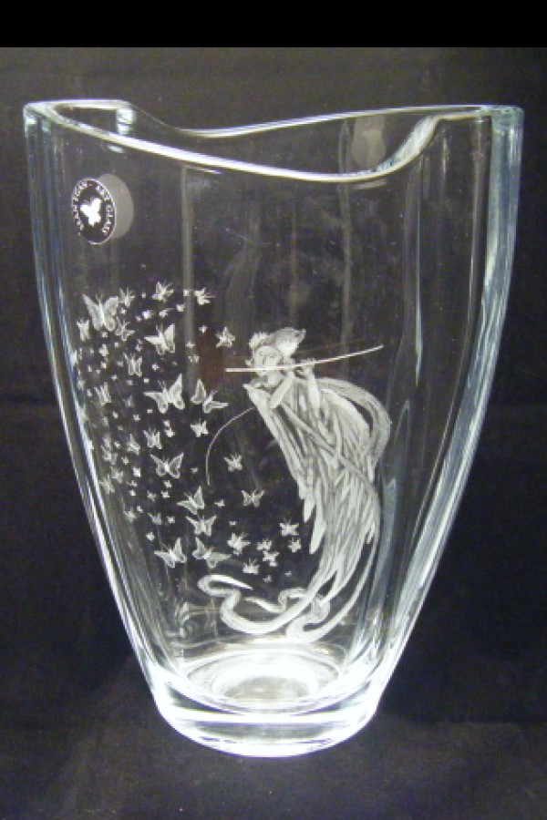9" crystal vase with a Chinese theme of a lady in the forest playing a tune for butterflies. "Lady in the Forest" theme available on other glass pieces.