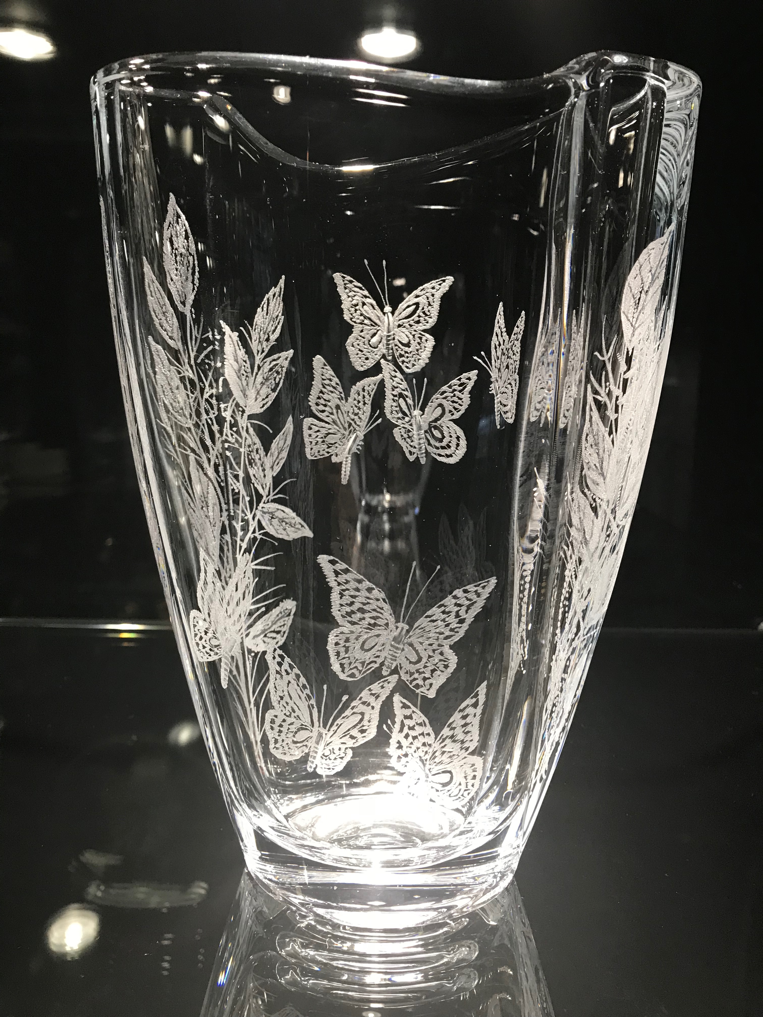 Butterflies engraved on a 9inch vase called a smile vase butterflies are great for designers