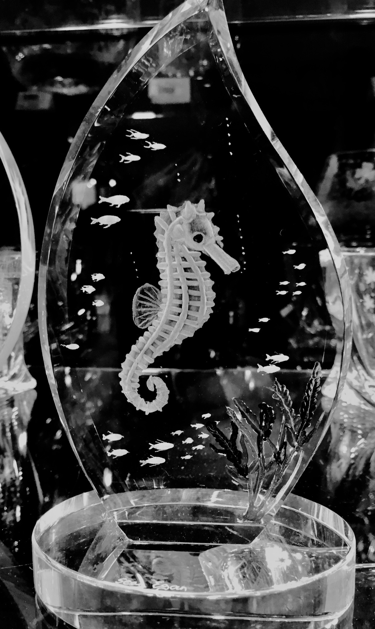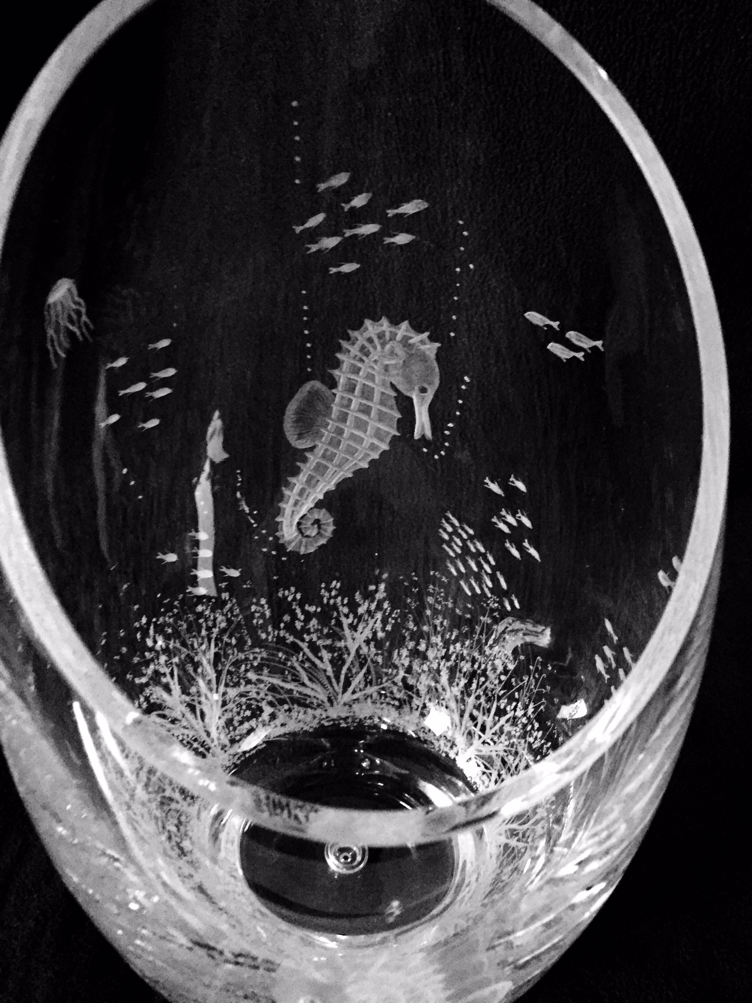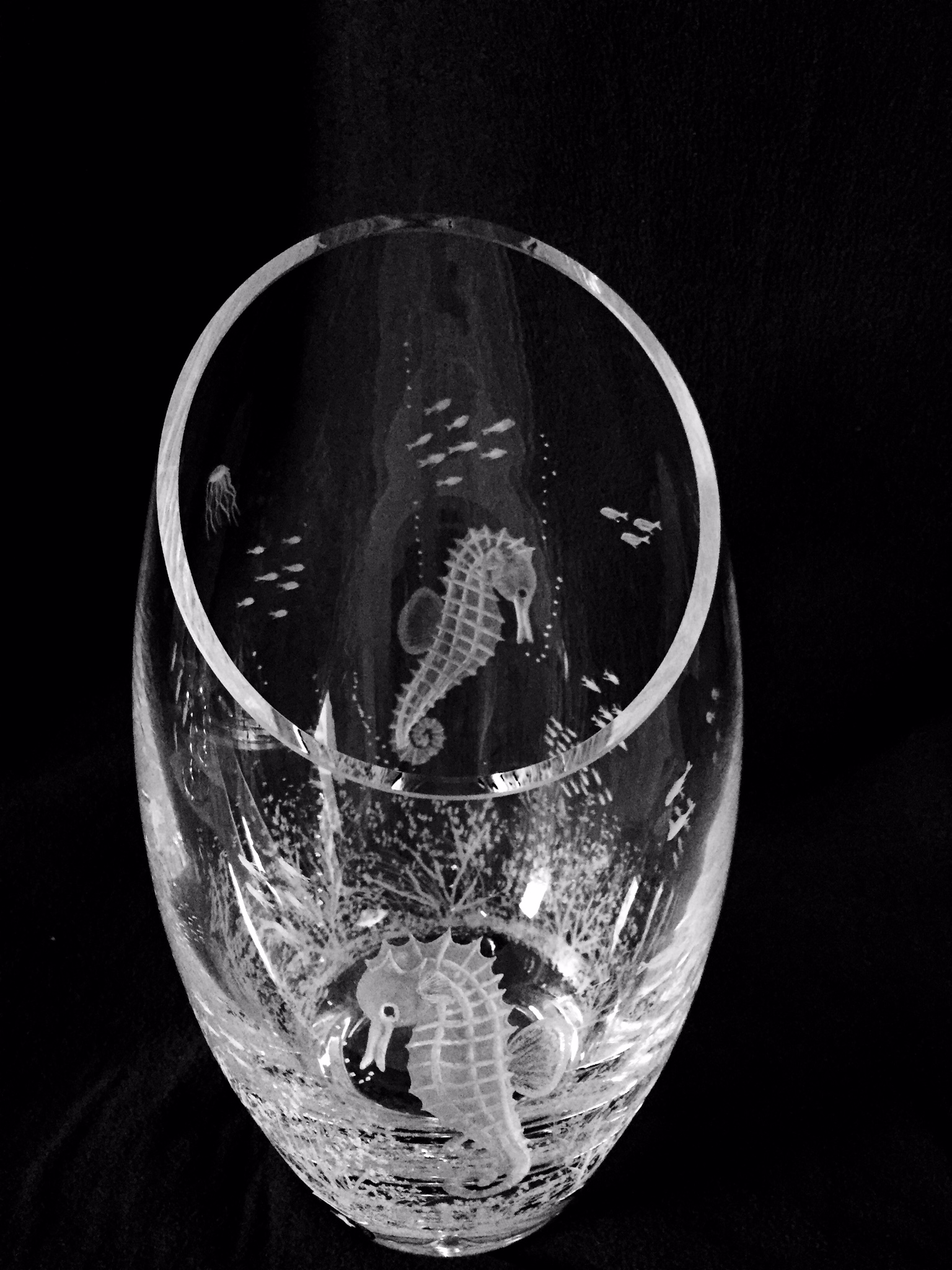 10" Vase decorated with a Sea Horse and underwater theme. Sea Horse design available on other glass items. For queries or order for bespoke items please contact Sean.