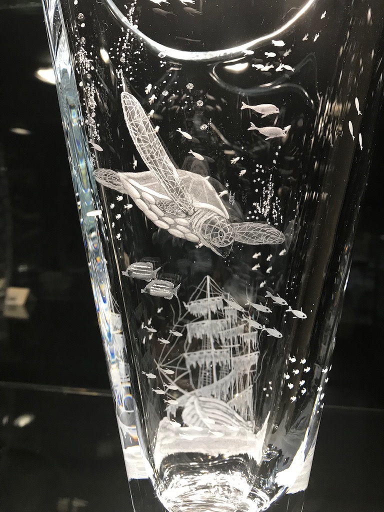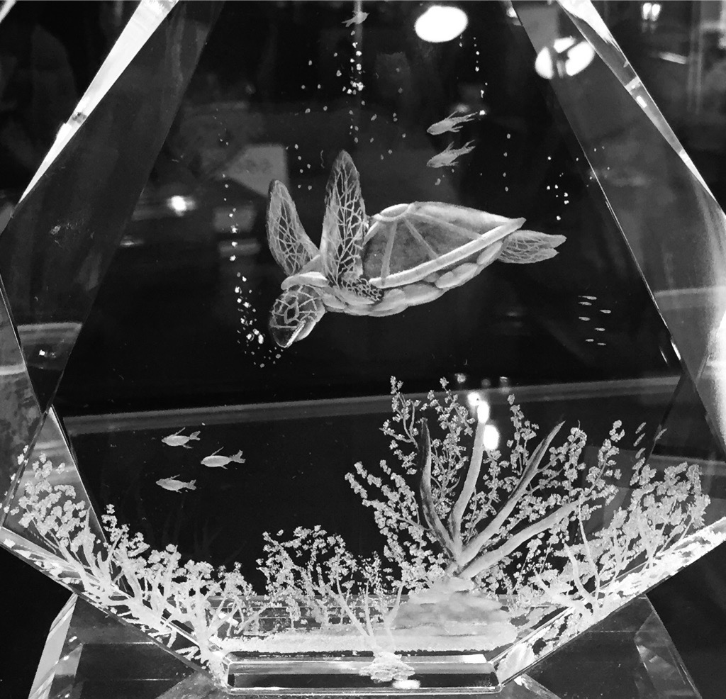 12 inch vase Decorated with the "Sea Turtle" theme which shows the turtle swimming underwater with see plants and small fish. 7.7"W x 12"H and weighing 4kg. Please contact to order and for shipping details.also Square , Round, and odd shapes crystal pieces can be sort for these ideas, Decanters can also be perfect for engraving.email me.