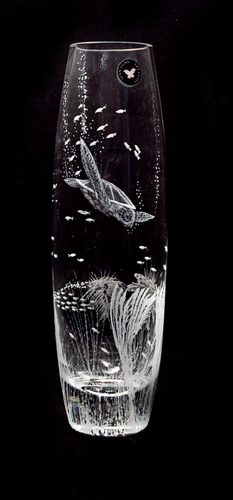 12" slim vase with a sea turtle in an ocean scene with small fish swimming around and some underwater plants. Sean specialises in Sealife and Wildlife scenes and the sea turtle is one of the most popular ones.