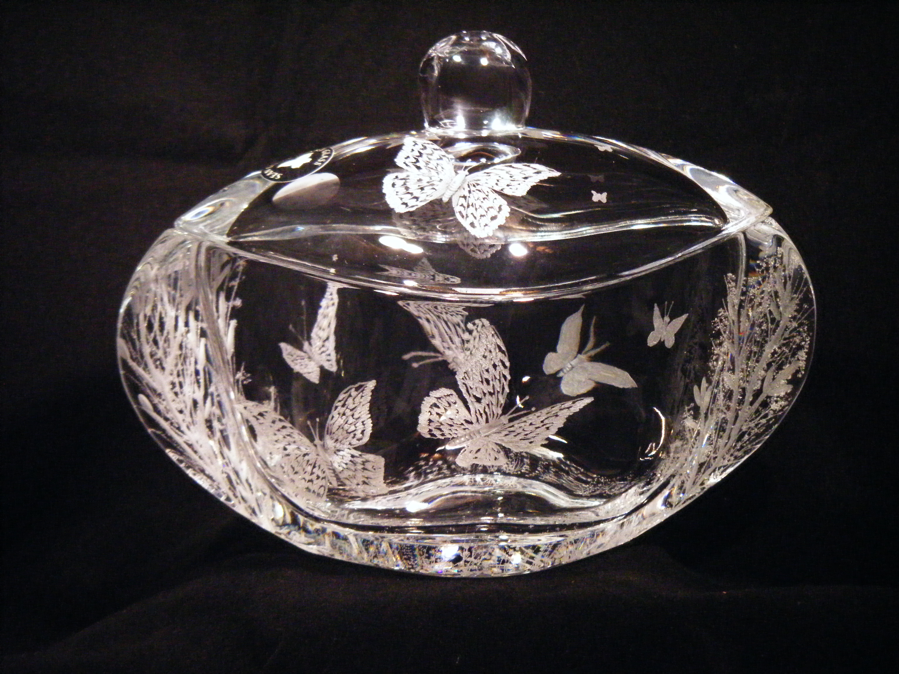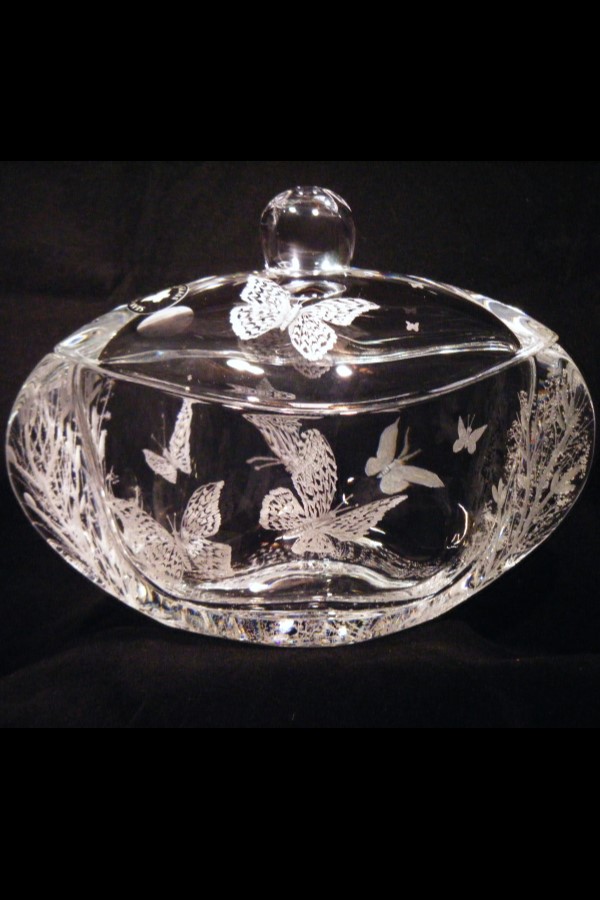 A crystal candy dish with lid, seen here with the popular "Meadow Butterflies" design is 5"H. also popular with dragonflies.