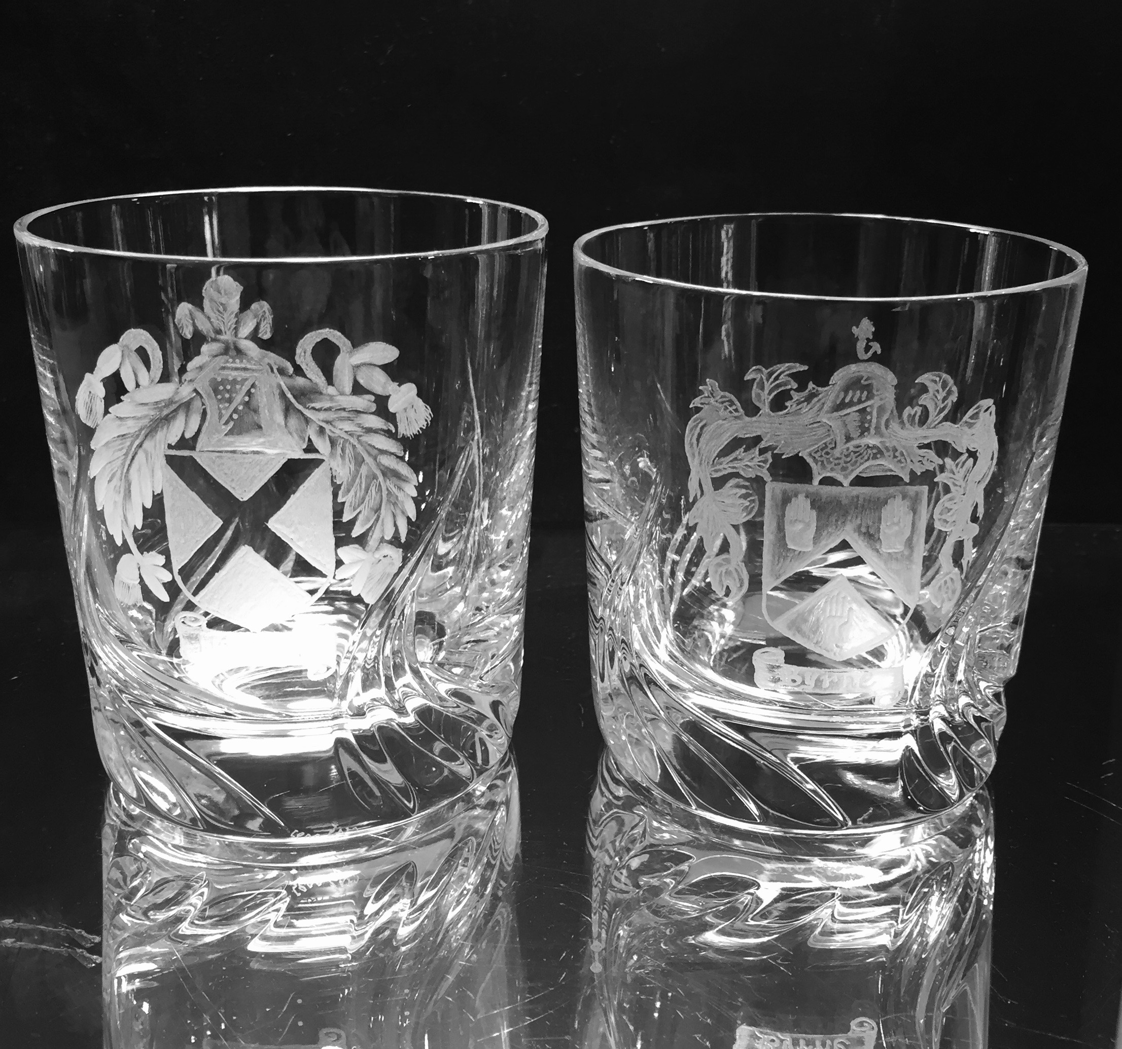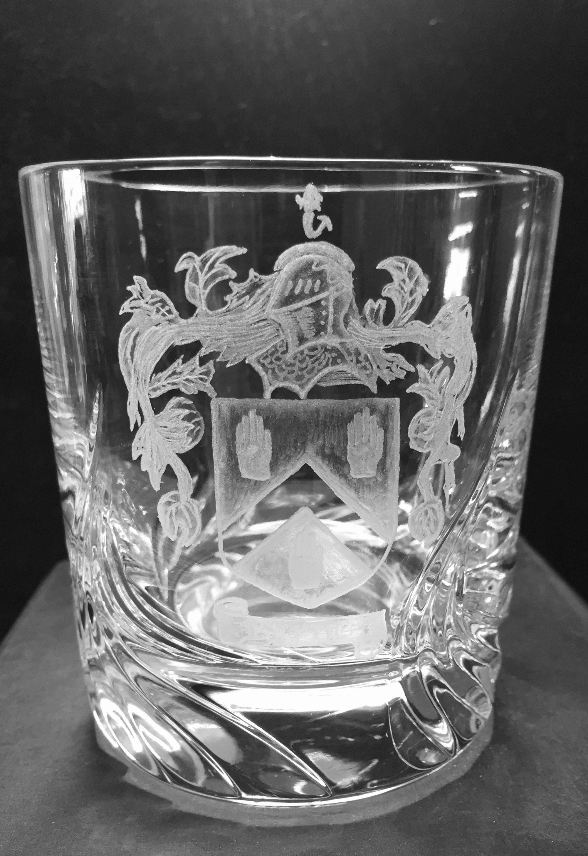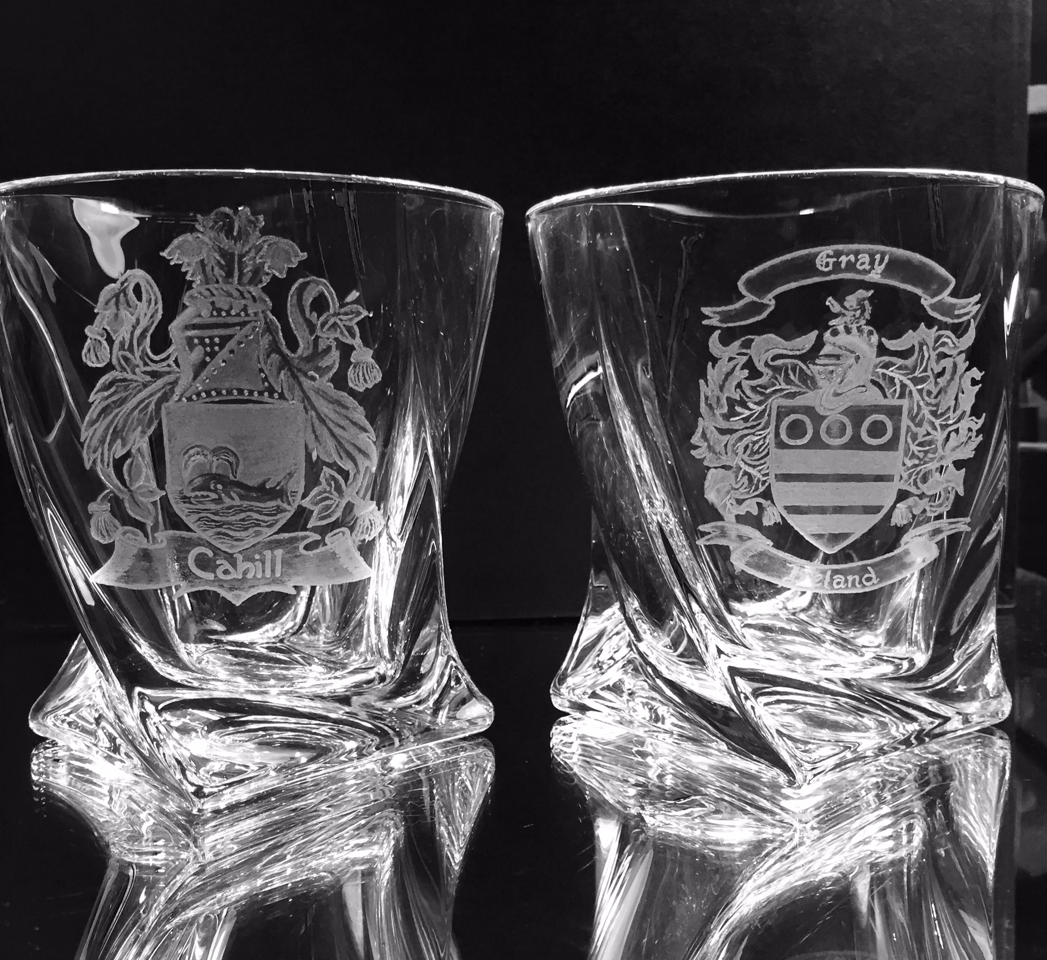 10 oz Tumblers Whiskey glasses with family name crests engraved a must for any bar ....Any crest available. Tumblers with crests are sold in pairs 3.6"W x 3.8"H