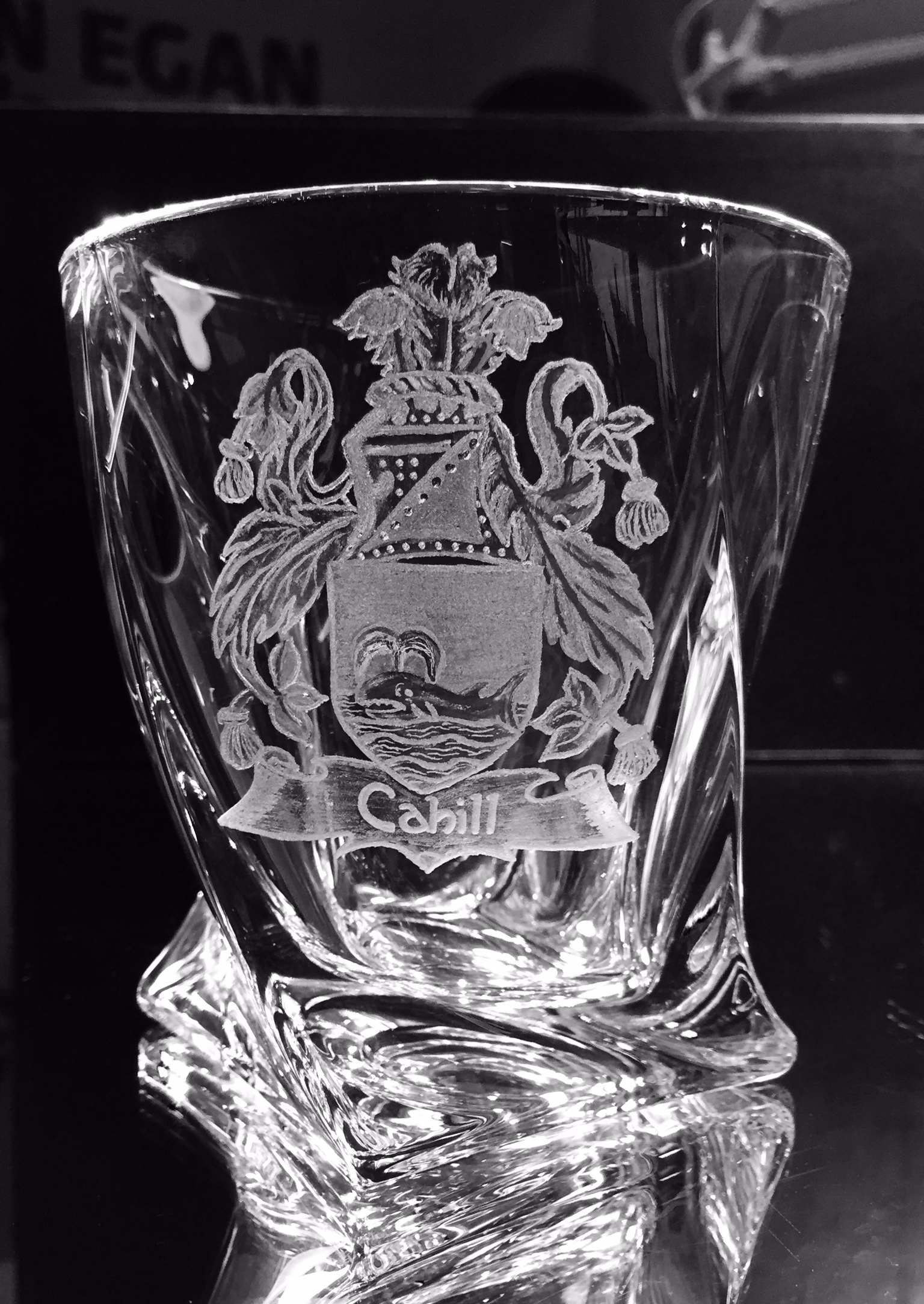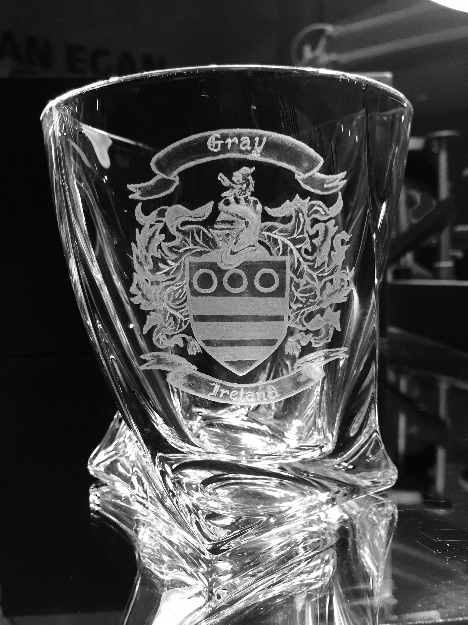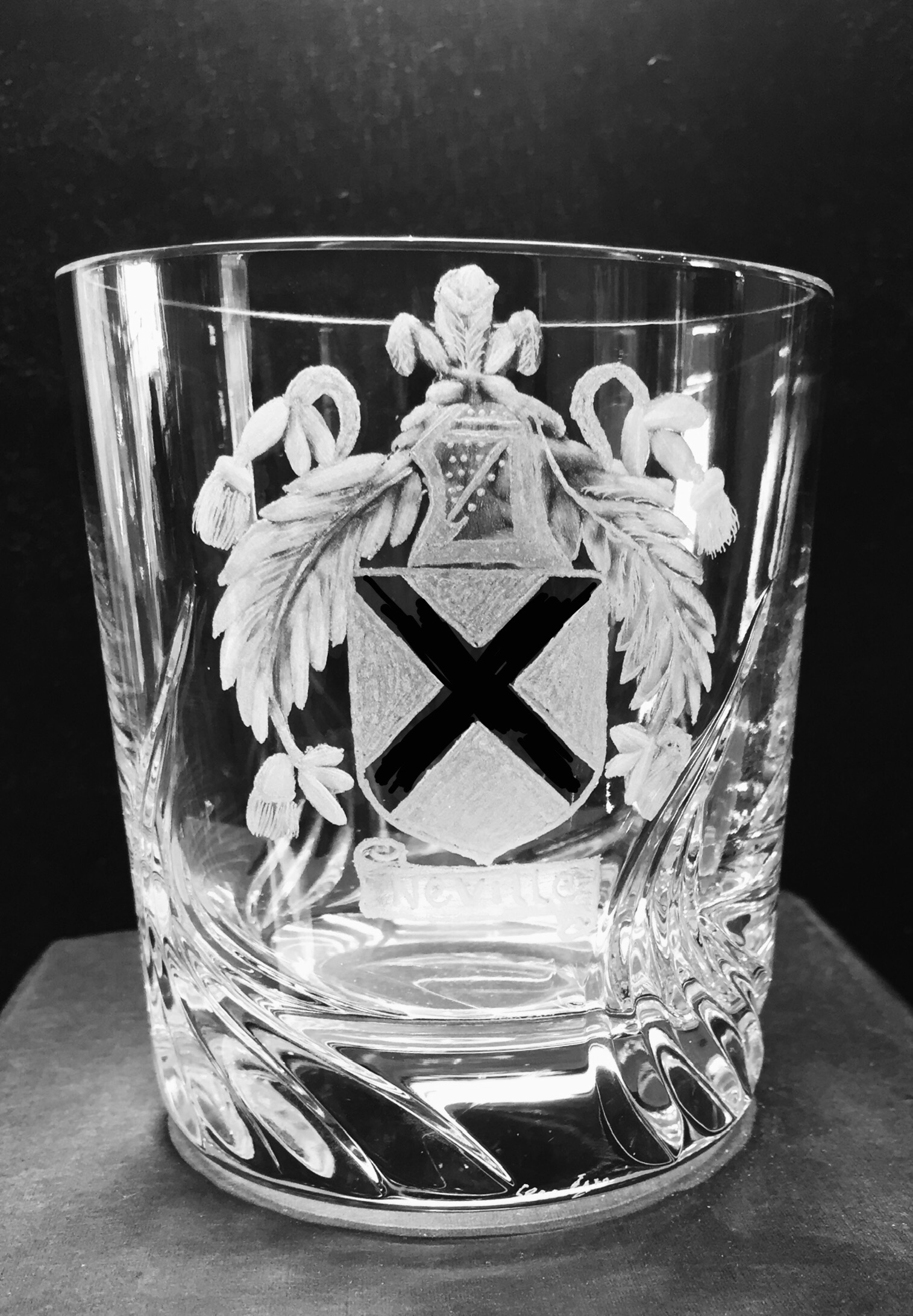 10 oz Tumblers Whiskey glasses with family name crests engraved a must for any bar ....Any crest available. Tumblers with crests are sold in pairs 3.6"W x 3.8"H