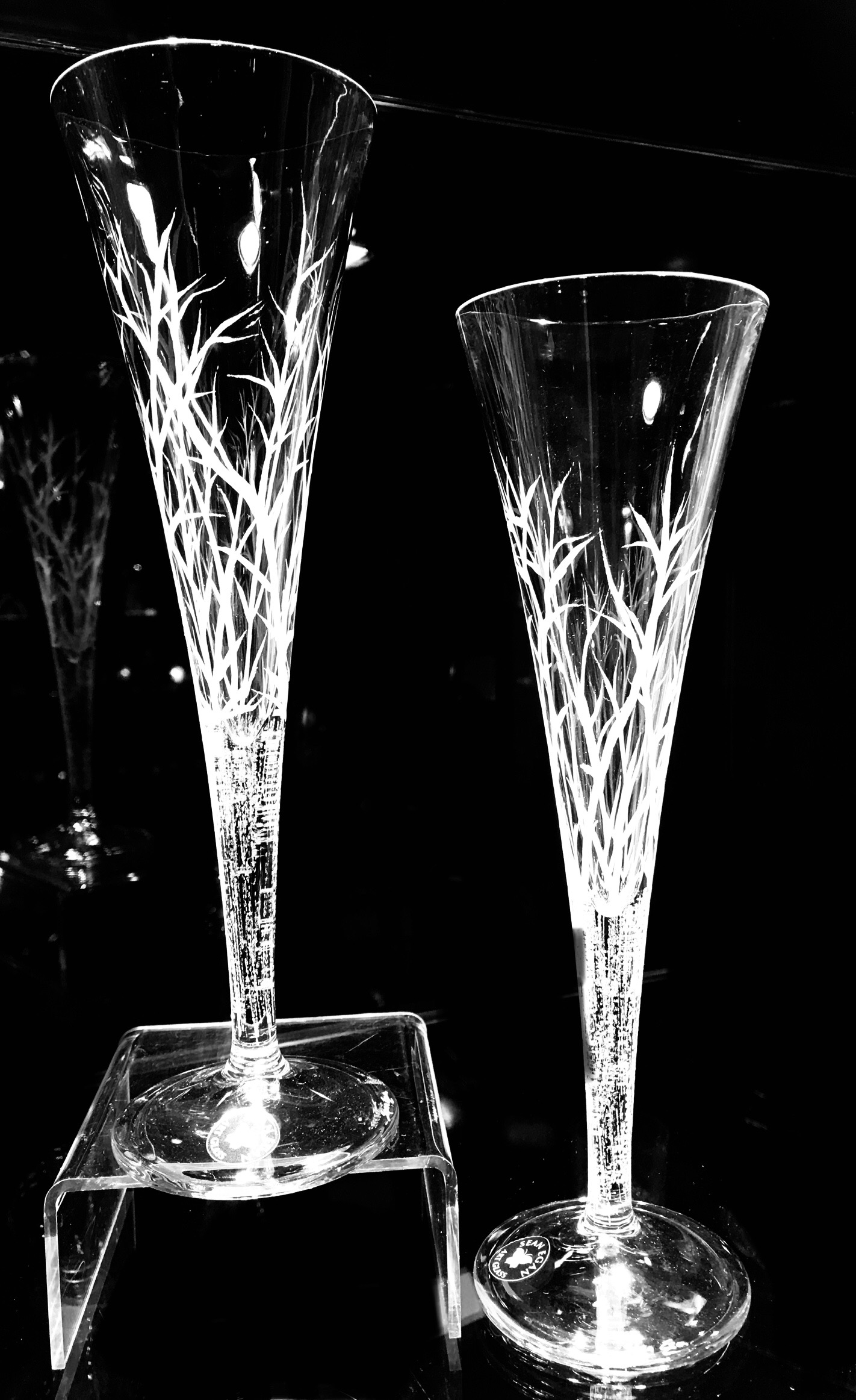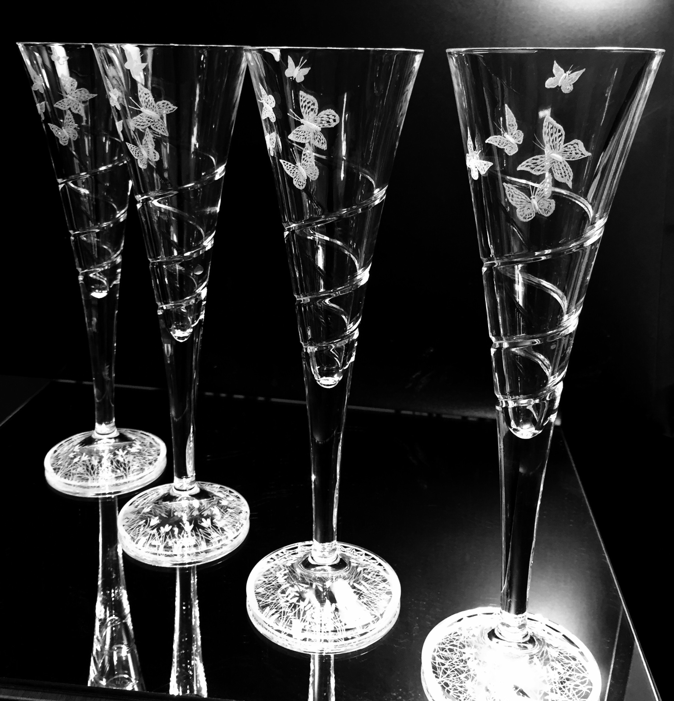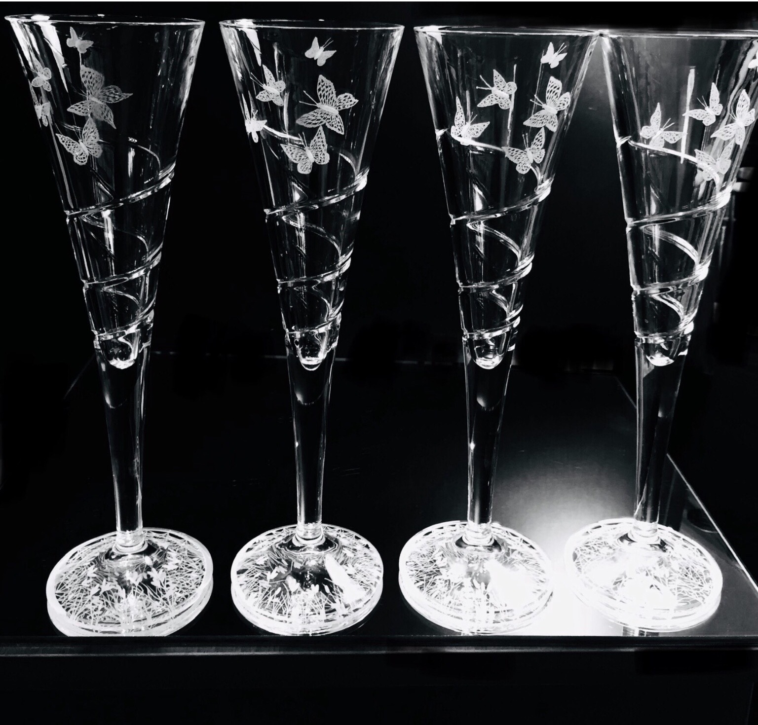 9" Toasting Flutes engraved with the first one is Wild Forest Design ,and the second one Fall design ,the third one is the Spring Design, also Butterflies, the Last ones are called