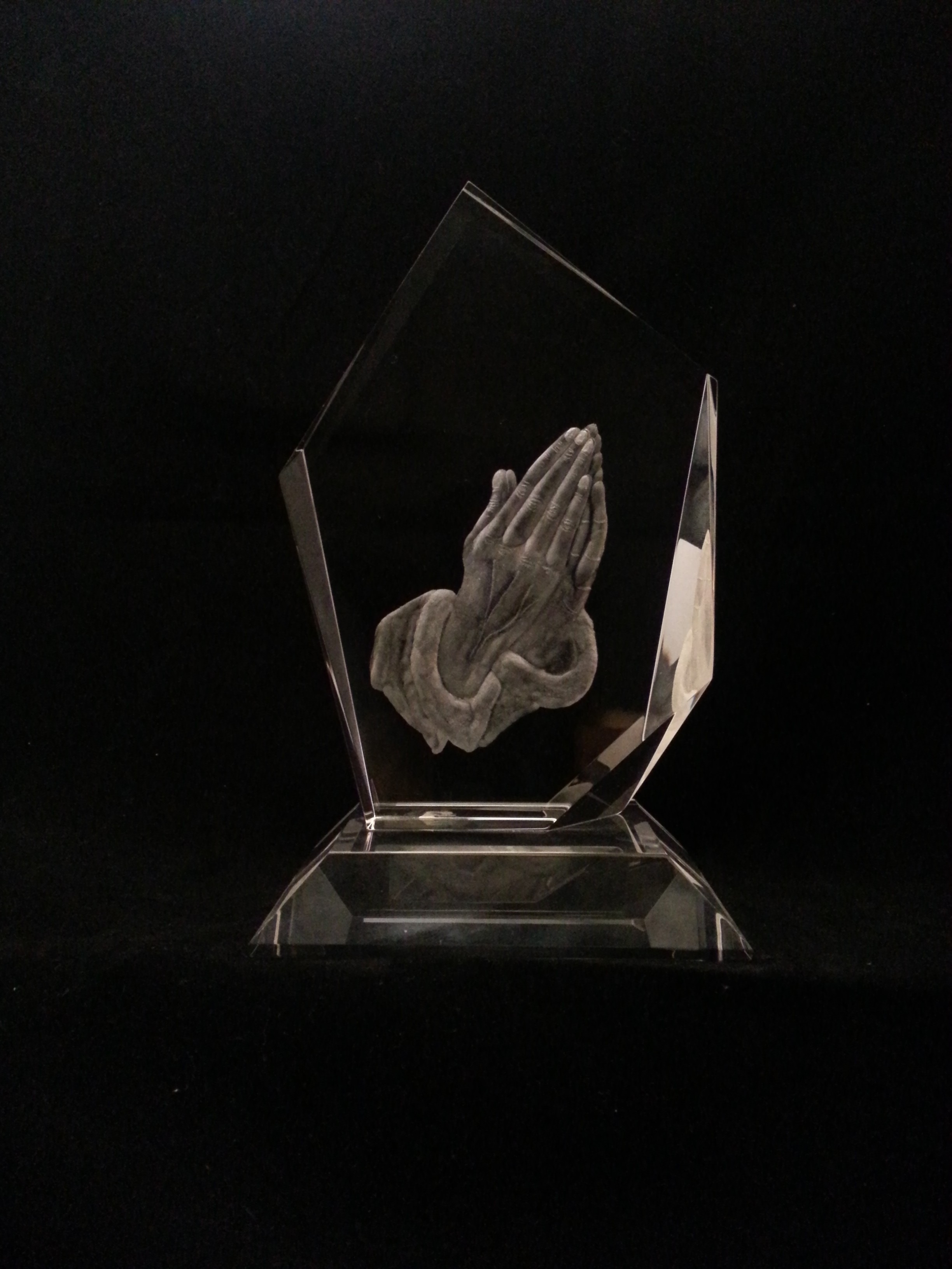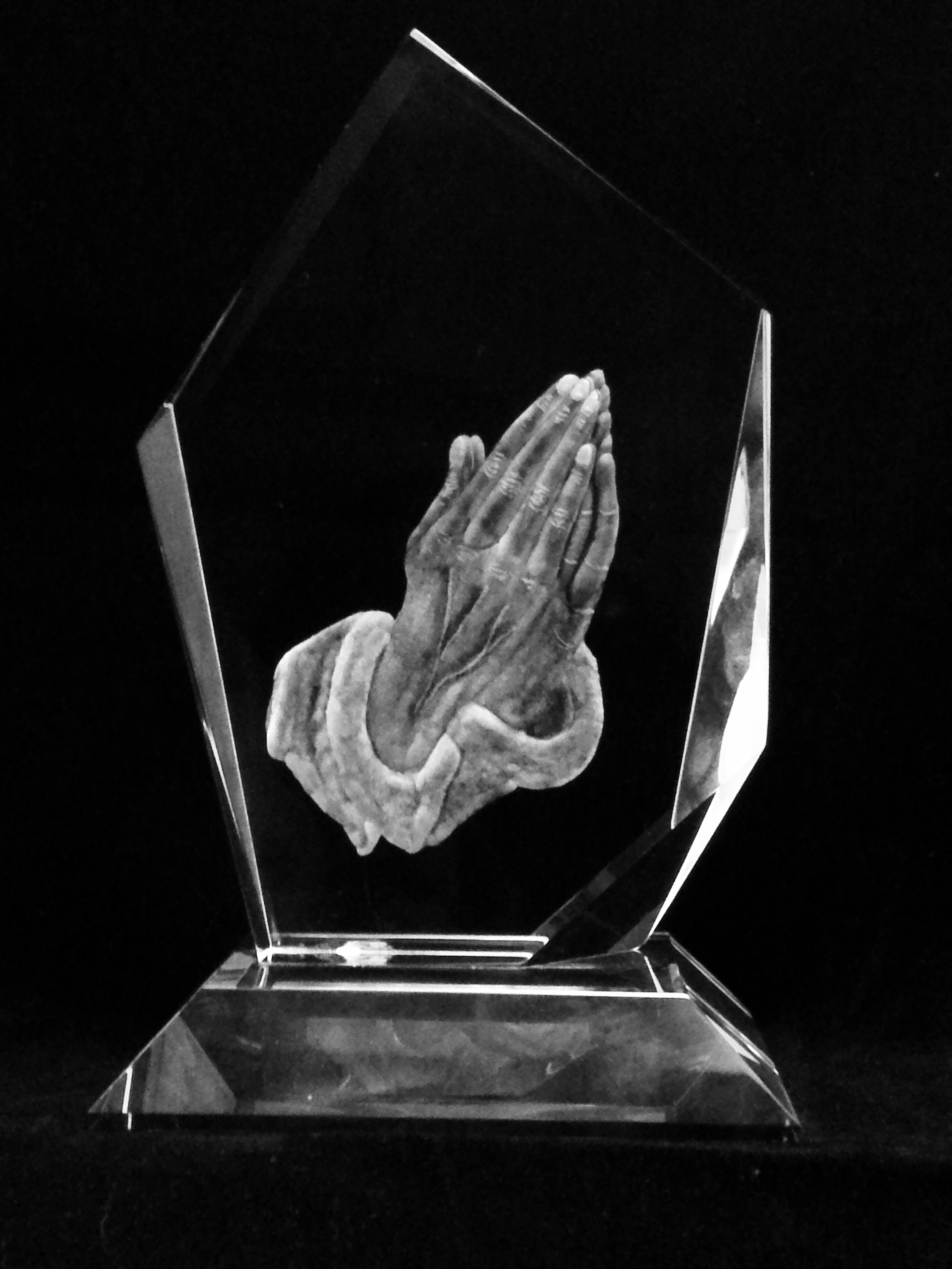 Glass Plaque with religious motif of "hands in prayer". Suitable for a religious celebrations such as a baptism, first holy communion, or confirmation, the "hands in prayer" can be engraved on any glass.
